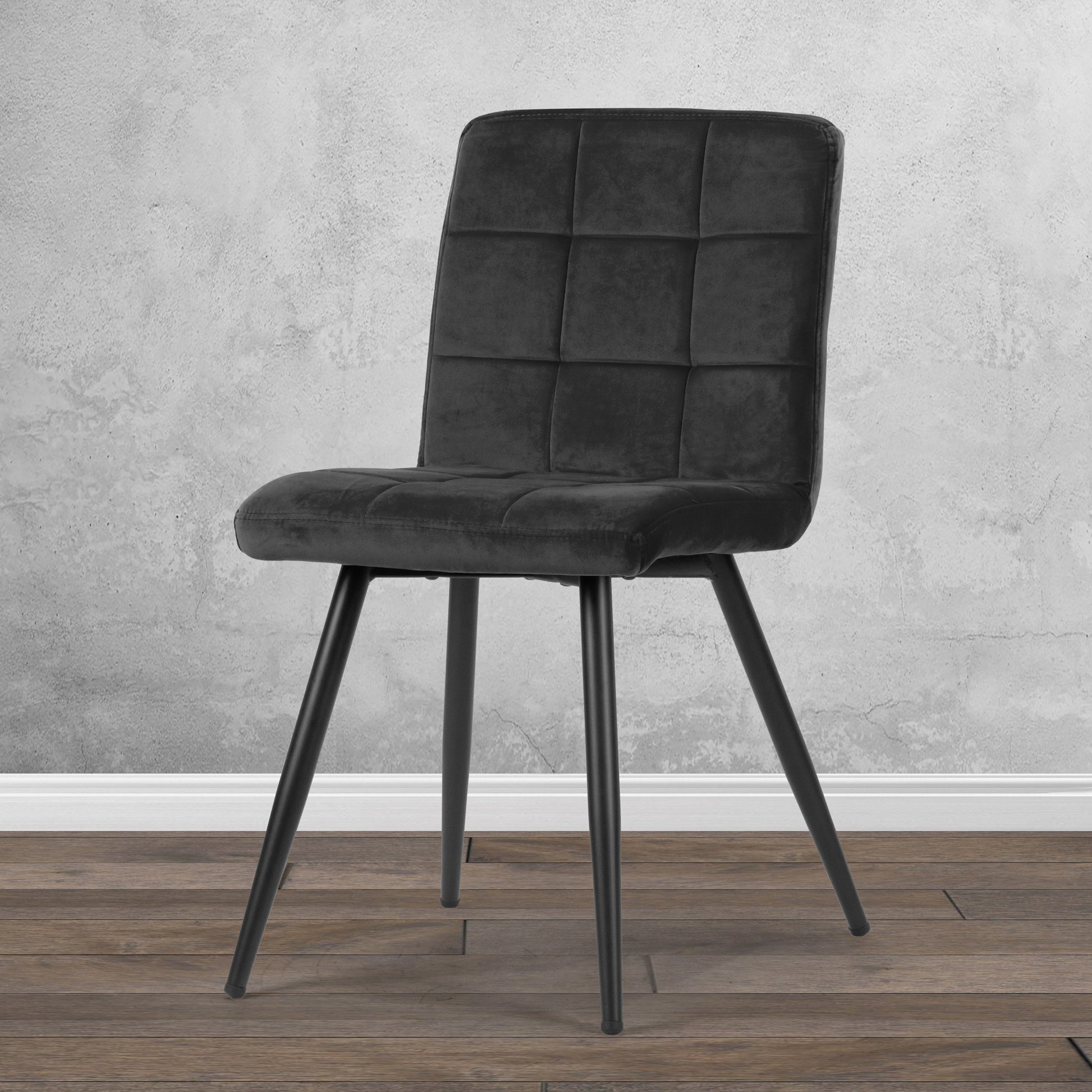 This modern dining chair refreshes your dining room with a chic modern touch. Black velvet upholstered foam seat offers comfort for sitting. Sturdy metal legs are powder coated black. Decorative stitching on the seat and back add details and delicacy to the design. Minor assembly needed. Spot clean recommended.