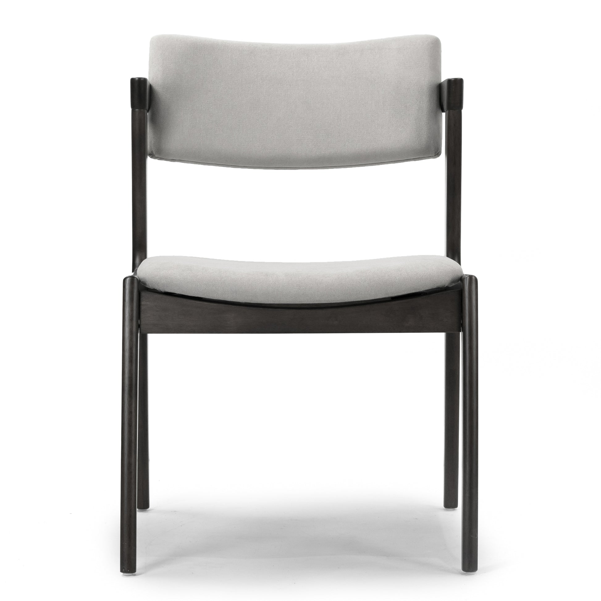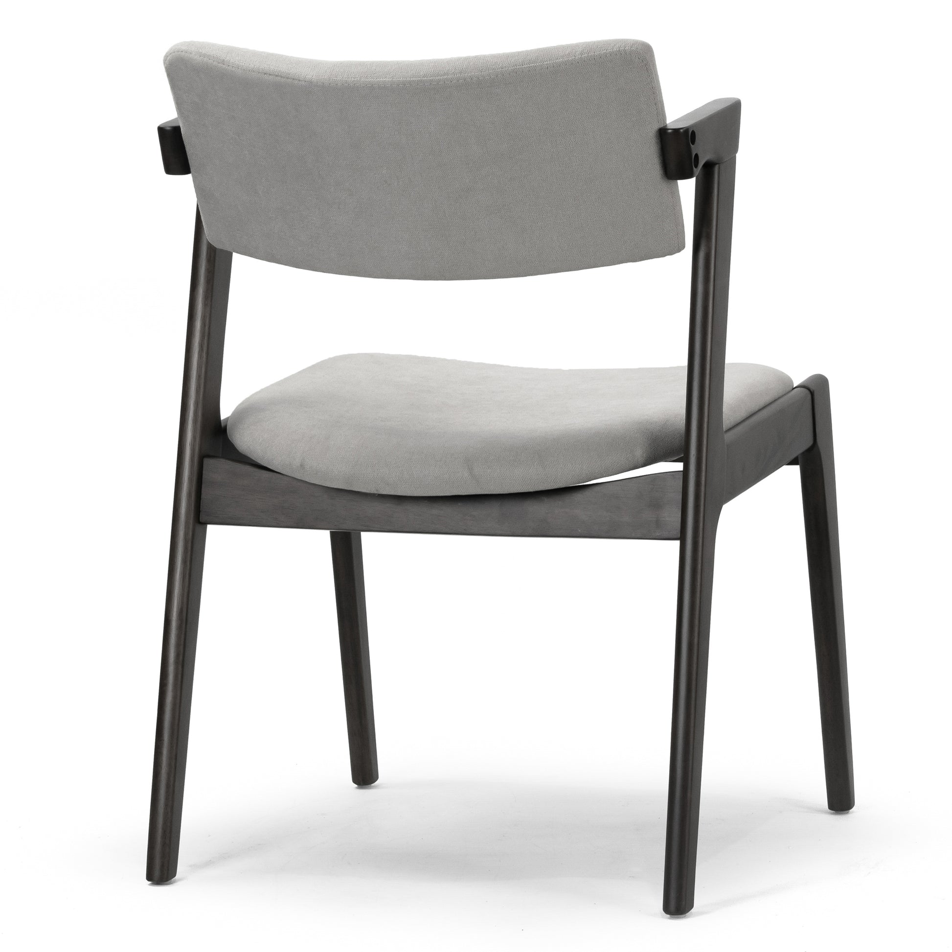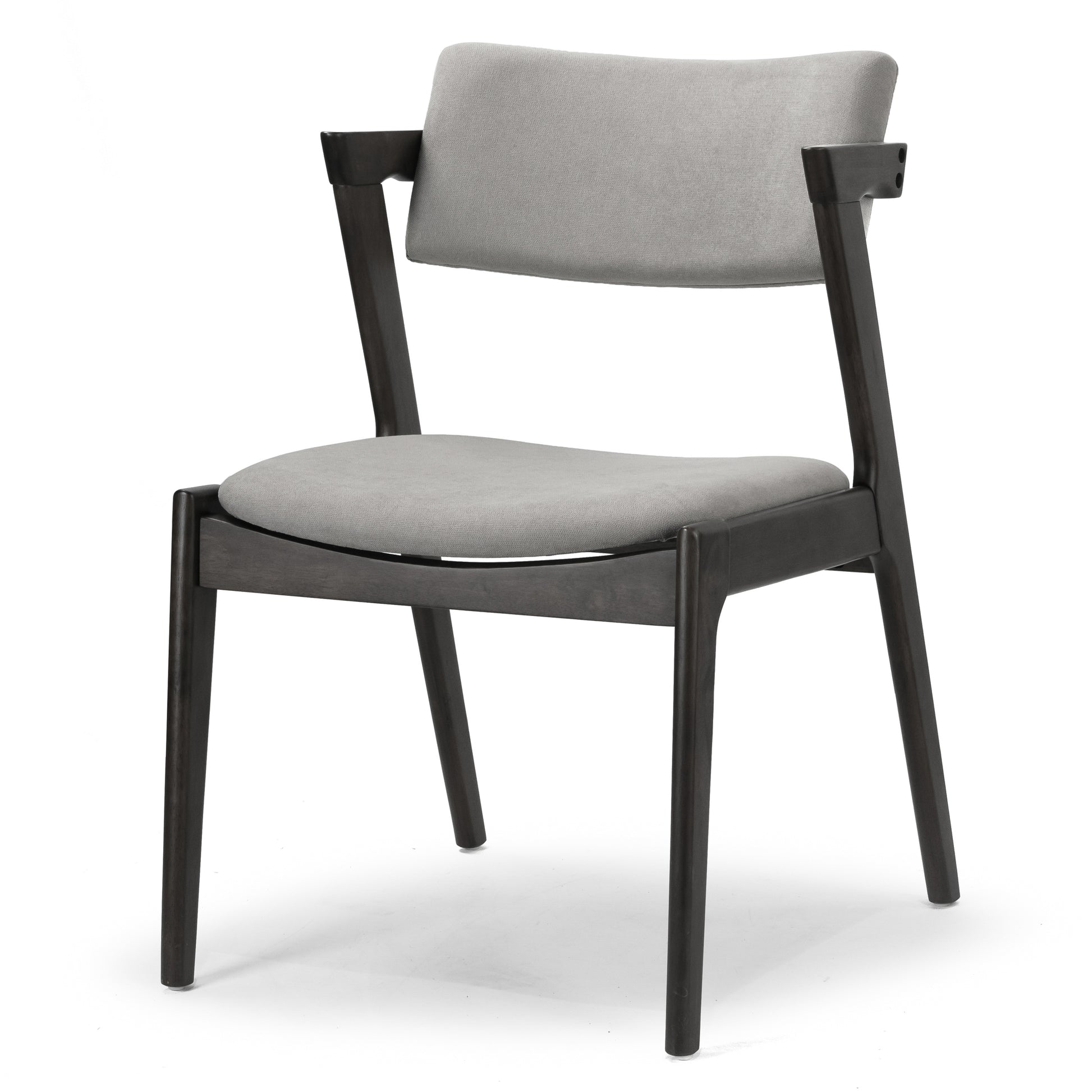 Modern solid wood chair with upholstered seat and back. Retro modern wing chair design is chic and classic. This dining chair has light grey fabric upholstered seat and back, which is filled with medium density foam cushion for long time sitting comfort. Black chair frame and legs are made of solid rubberwood, which offers sturdiness and durability. Assembly needed. Spot clean recommended.