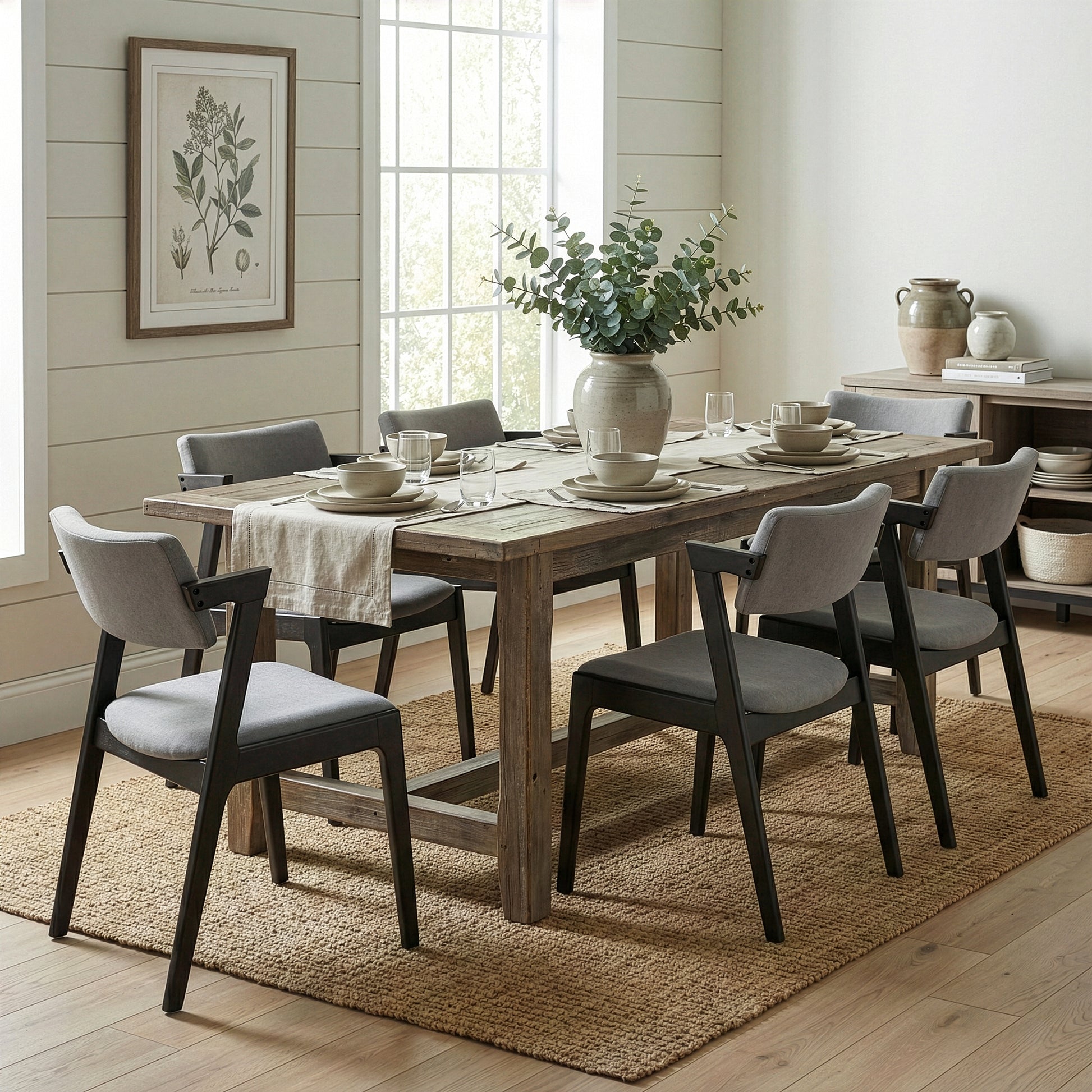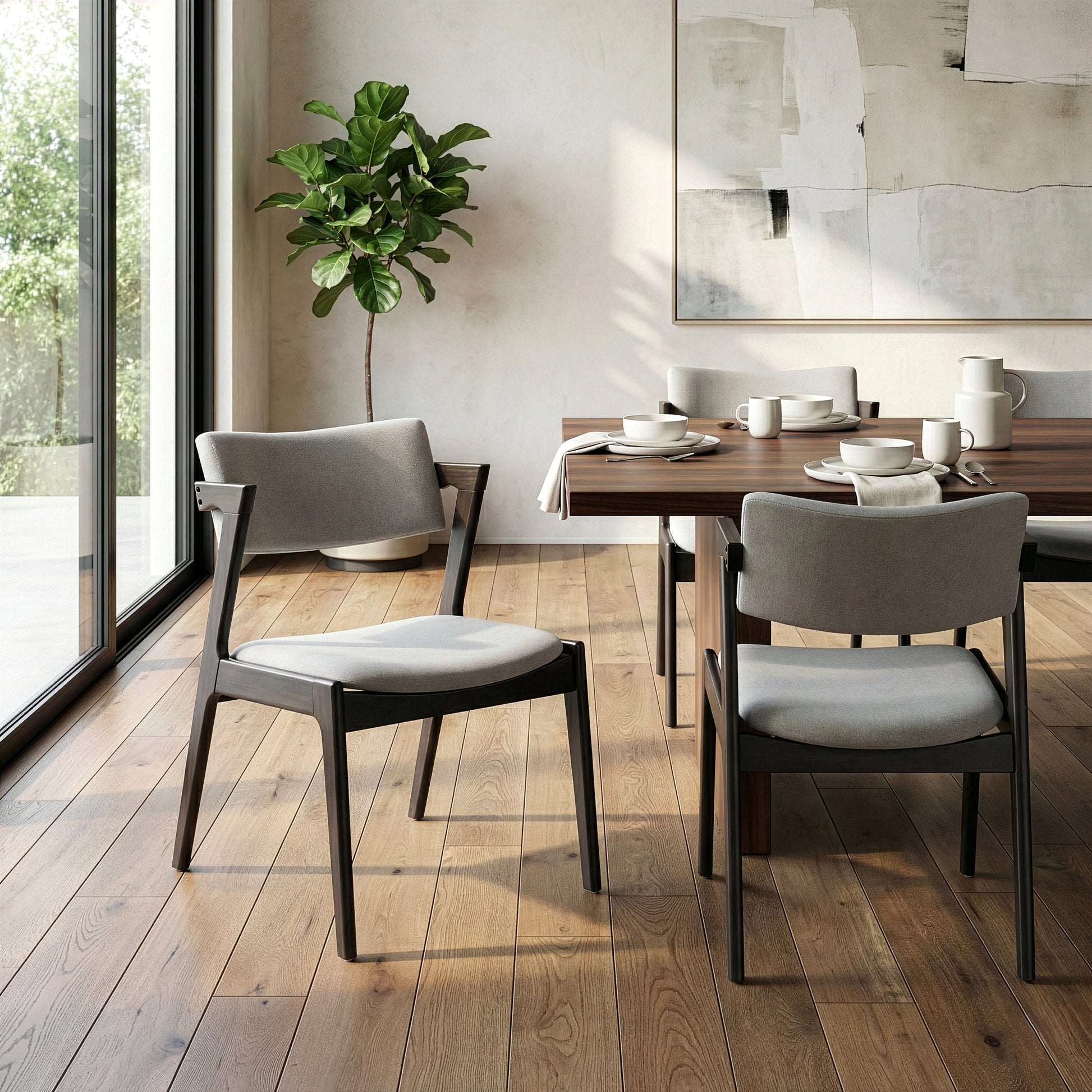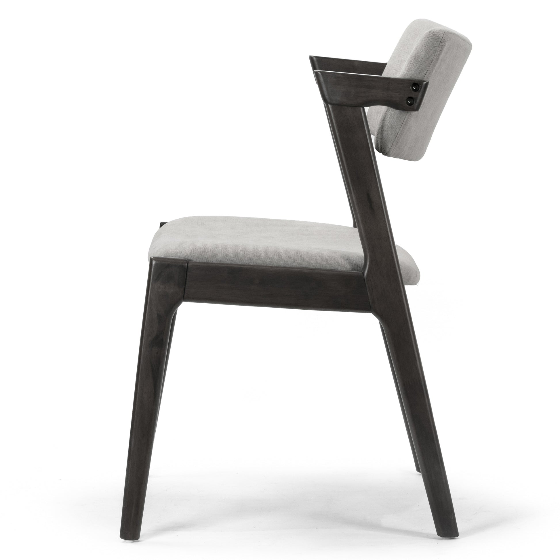 Modern solid wood chair with upholstered seat and back. Retro modern wing chair design is chic and classic. This dining chair has light grey fabric upholstered seat and back, which is filled with medium density foam cushion for long time sitting comfort. Black chair frame and legs are made of solid rubberwood, which offers sturdiness and durability. Assembly needed. Spot clean recommended.