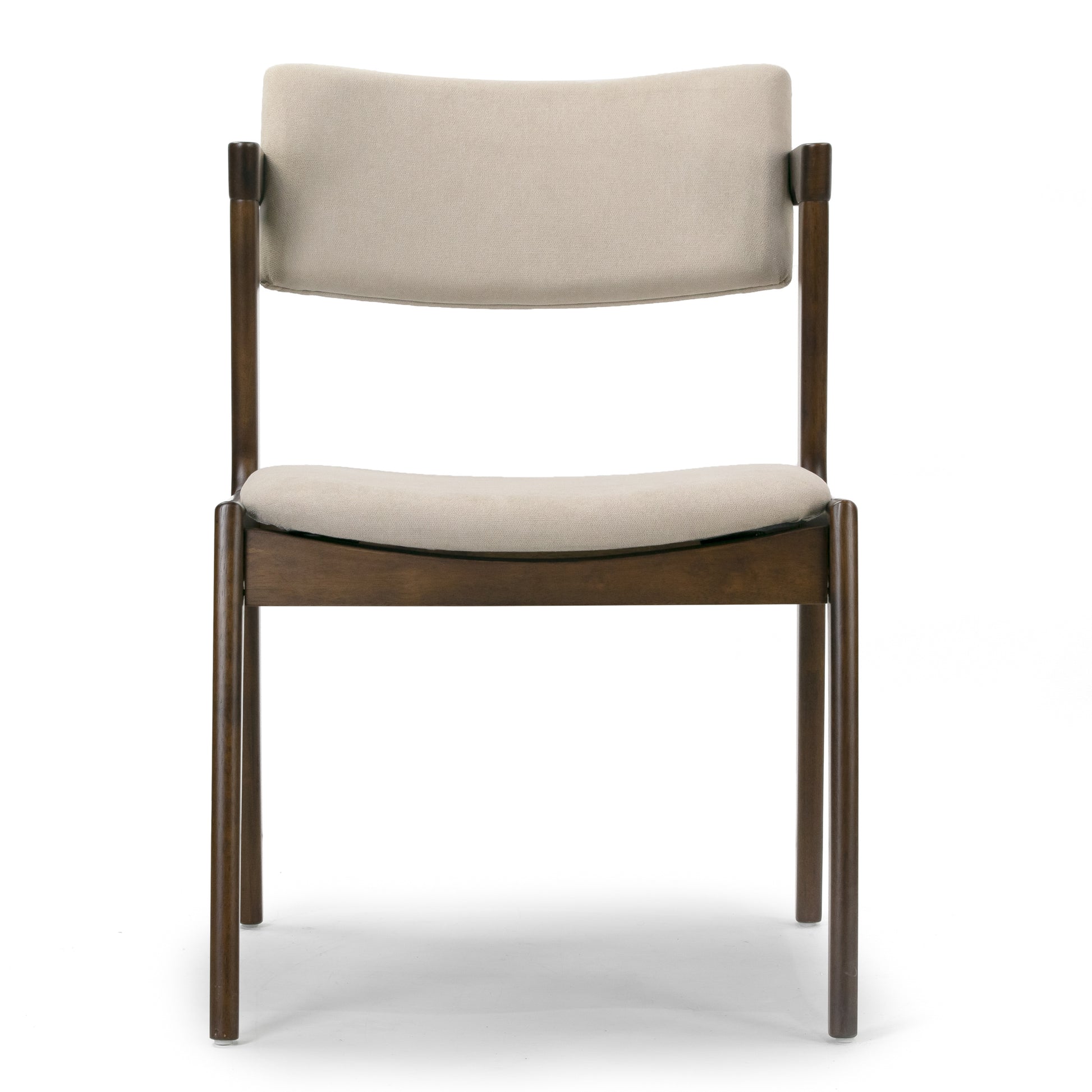 Modern solid wood chair with upholstered seat and back. Retro modern wing chair design is chic and classic. This dining chair has beige fabric upholstered seat and back, which is filled with medium density foam cushion for long time sitting comfort. Dark brown chair frame and legs are made of solid rubberwood, which offers sturdiness and durability.Assembly needed. Spot clean recommended.