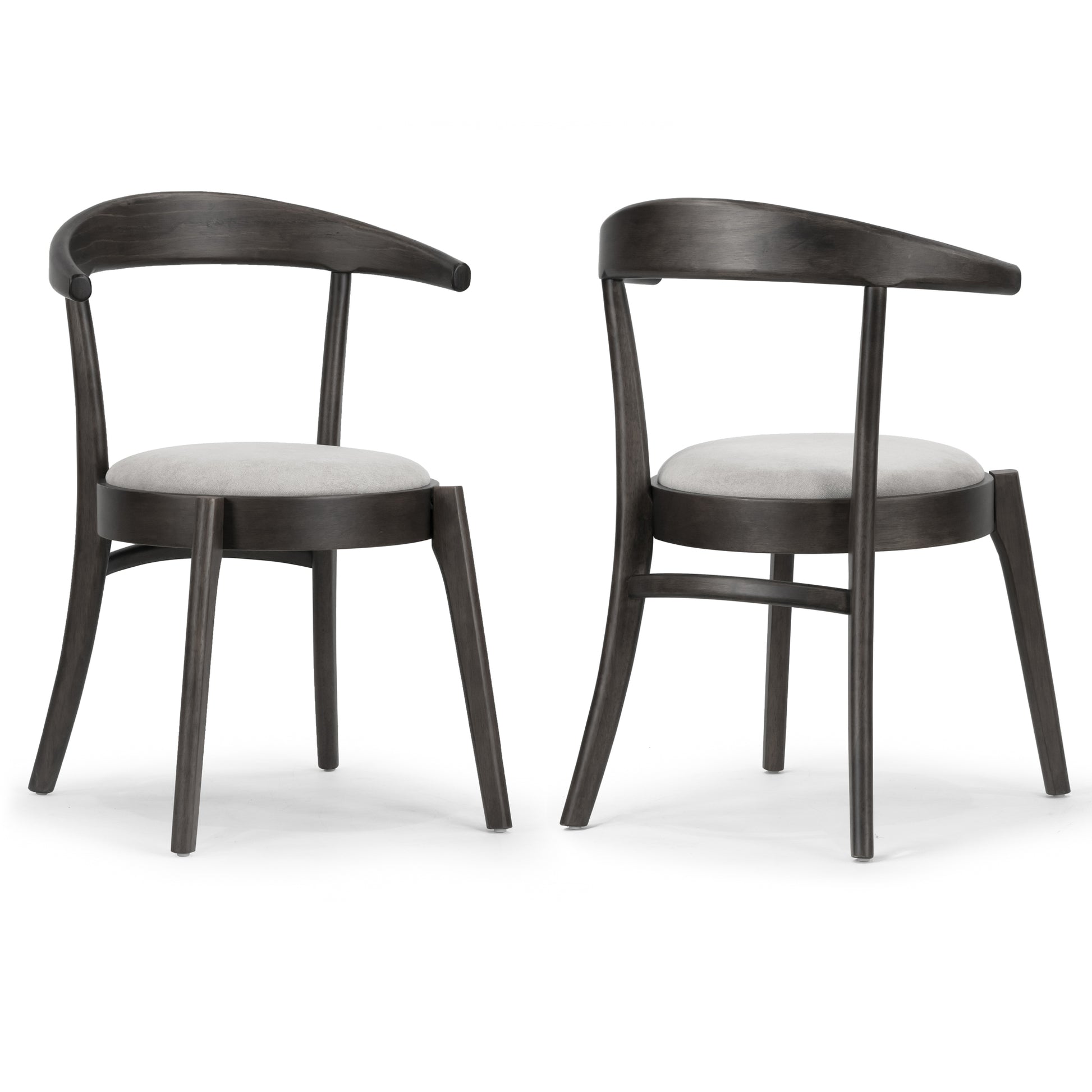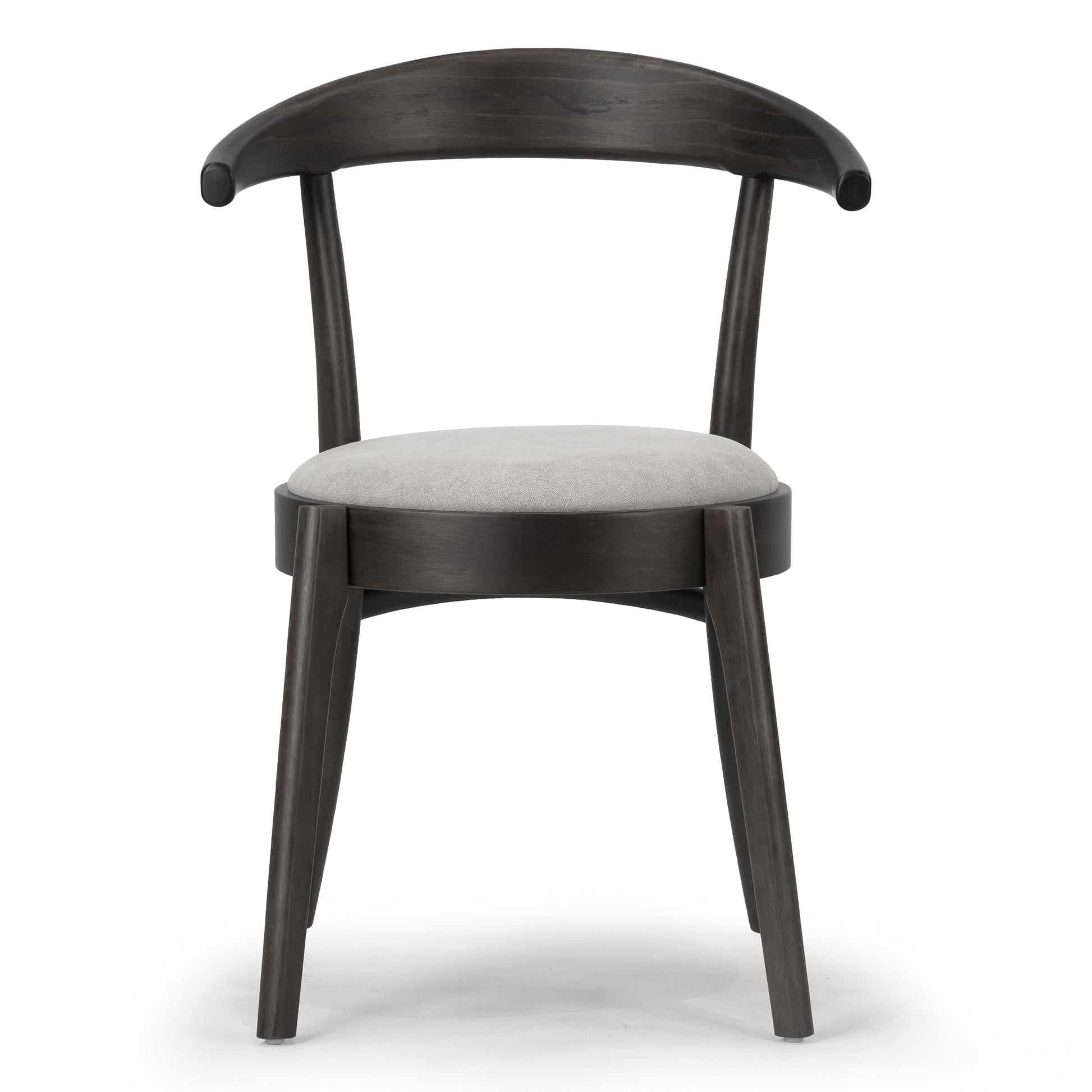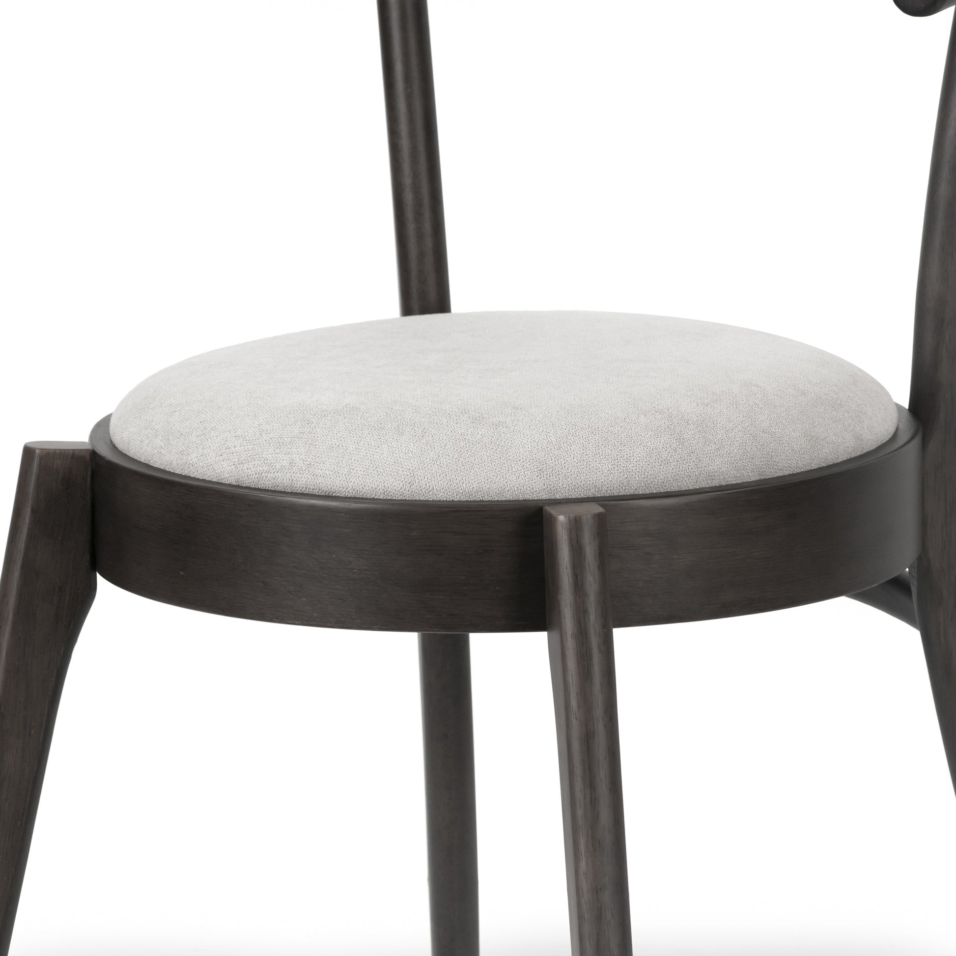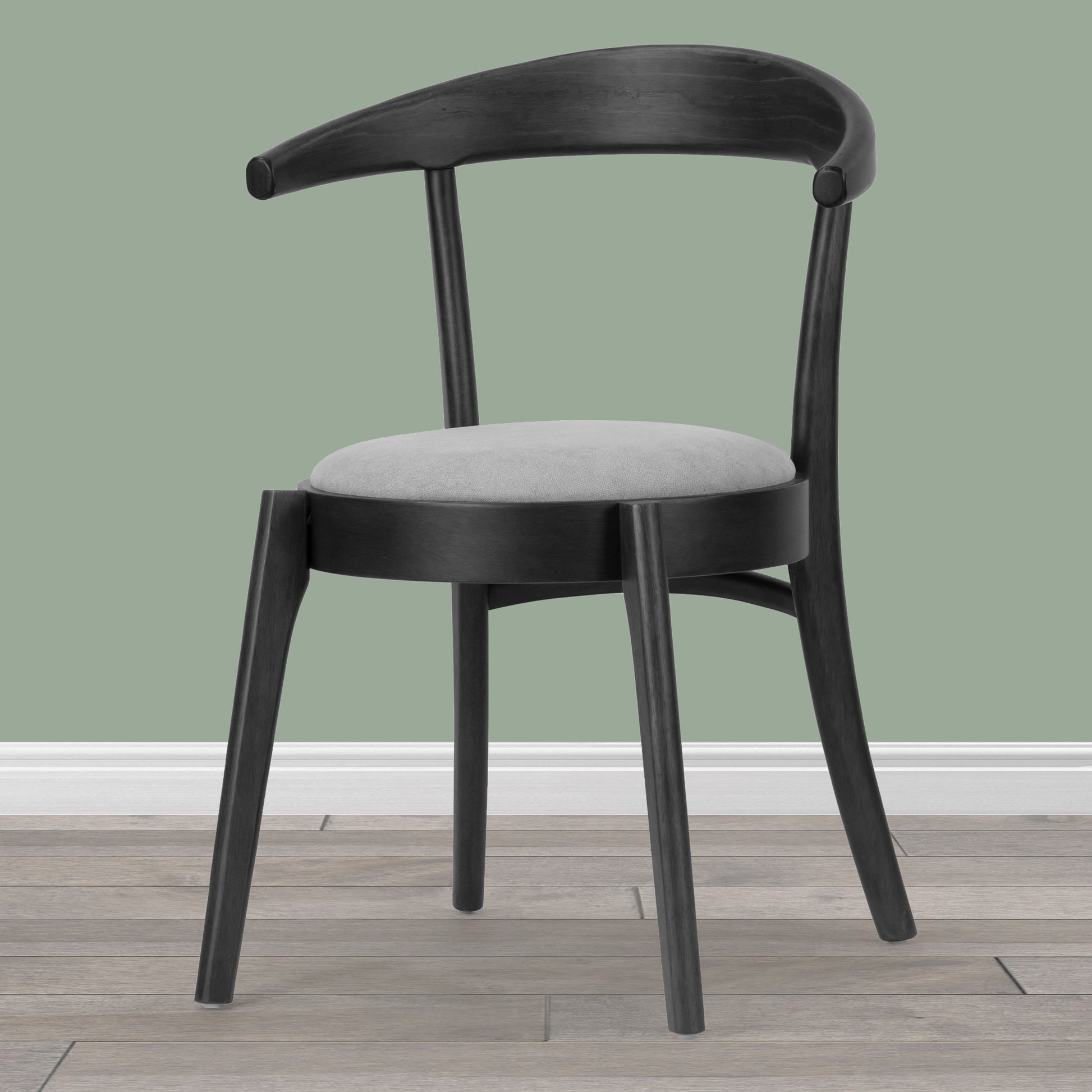 Retro modern solid wood chair with round seat and curved back. Retro modern curved back chair design is chic and classic. This dining chair has light grey fabric upholstered round seat, which is filled with medium density foam cushion for long time sitting comfort. Black chair frame and legs are made of solid rubberwood, which offers sturdiness and durability. Assembly needed. Spot clean recommended.