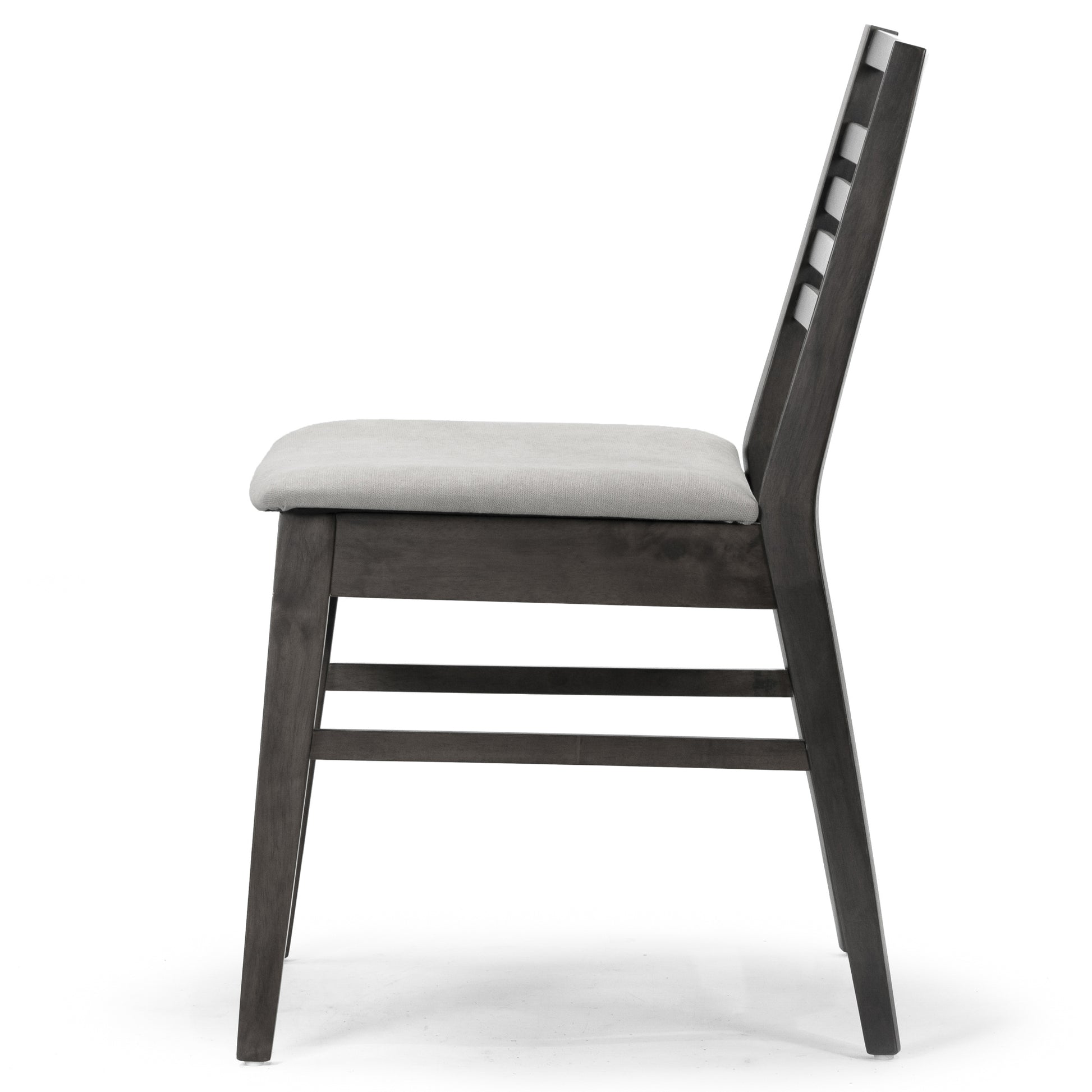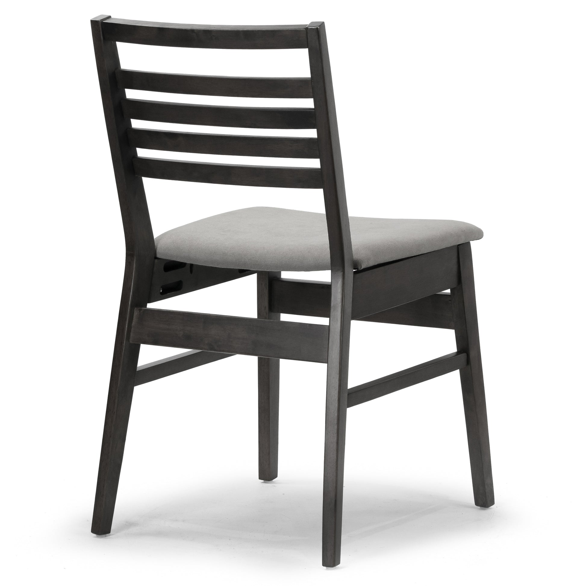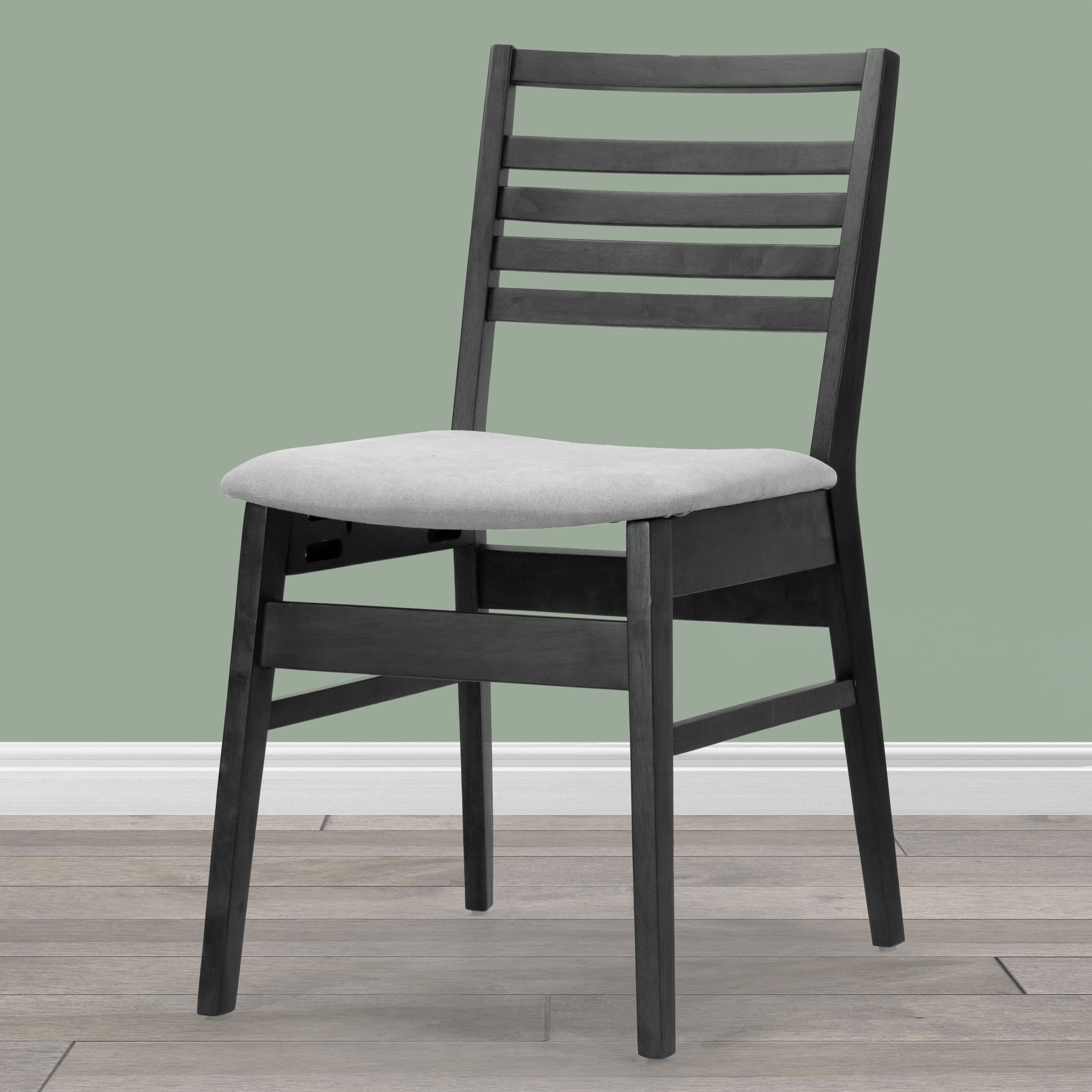 Classic wood dining chair design with upholstered seat and ladder back. This dining chair has light grey fabric upholstered seat, which is cushioned with medium density foam for long time sitting comfort. Whether you are having a meal with your family or enjoying a quiet afternoon of reading, this chair serves the purpose. Black chair frame and legs are made of solid rubberwood, which offers sturdiness and durability.Assembly needed. Spot clean recommended.