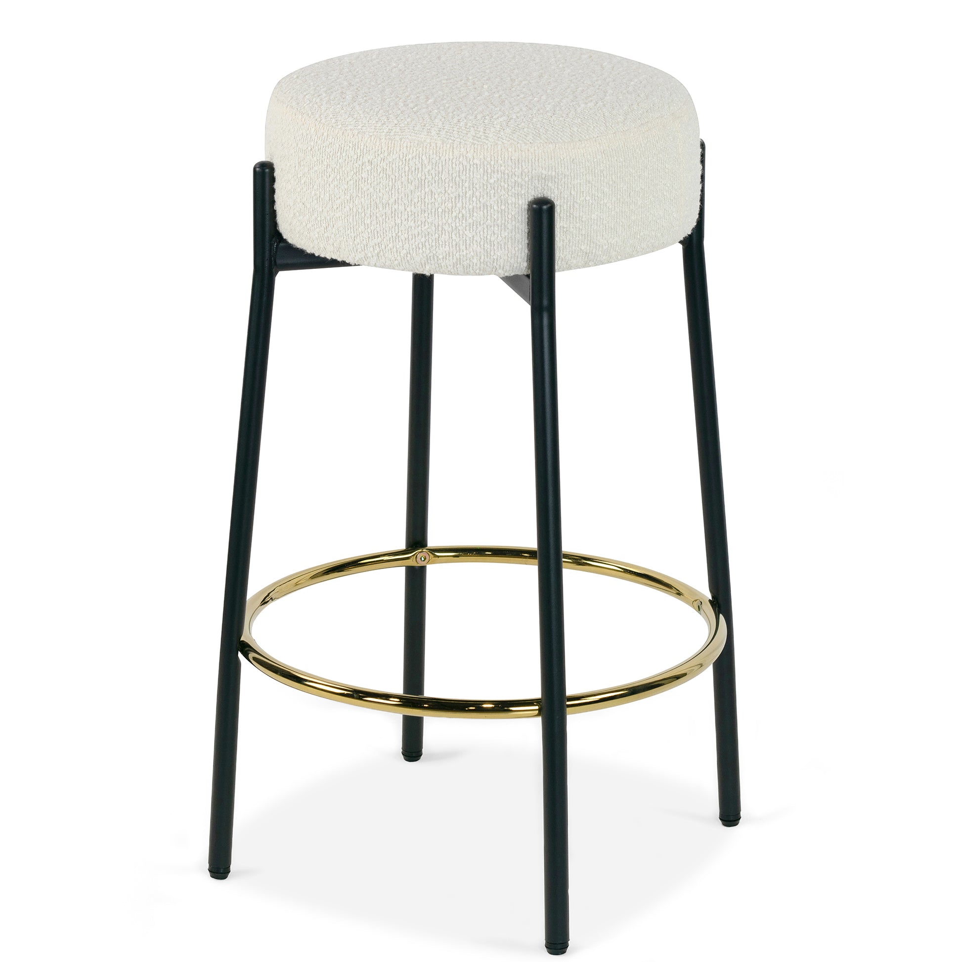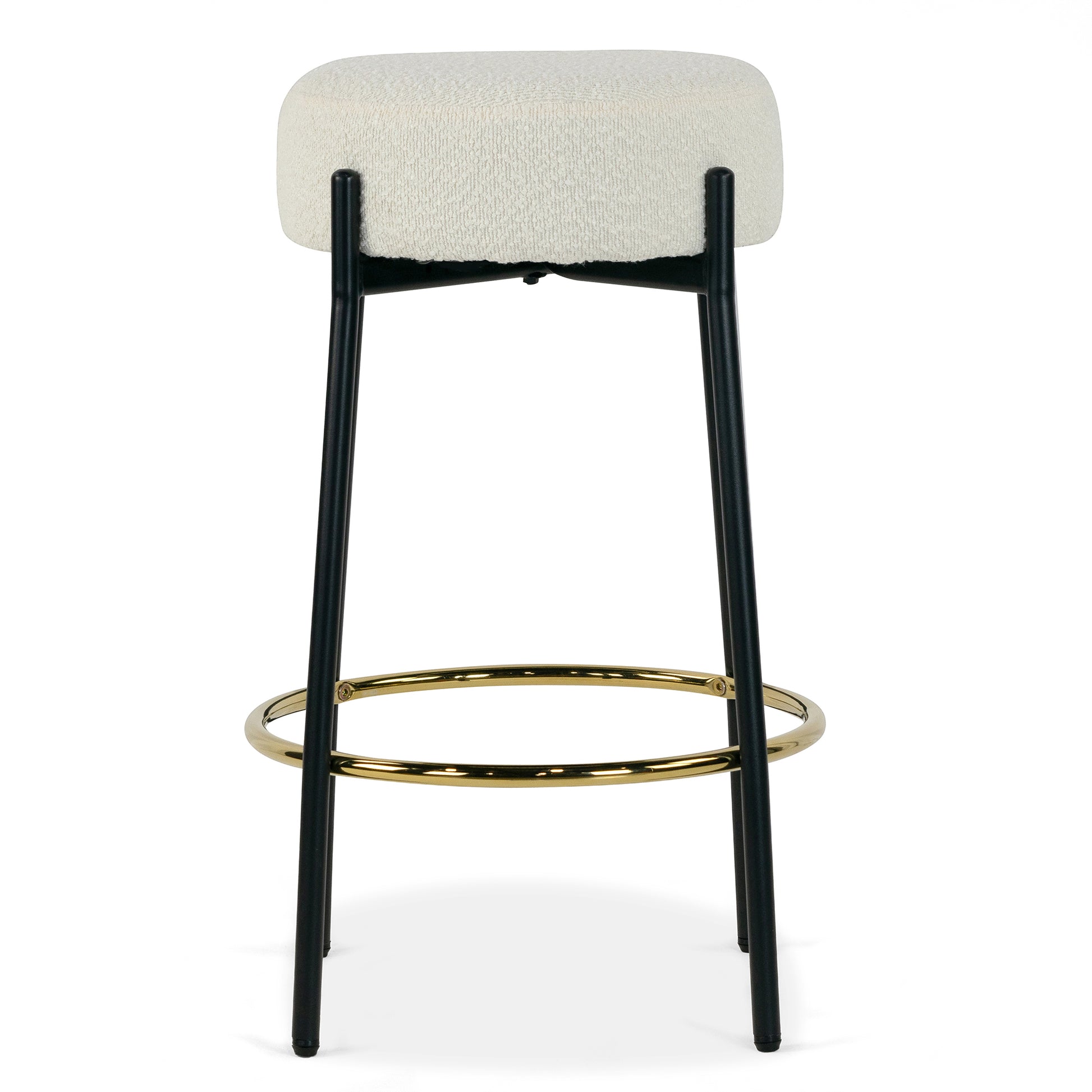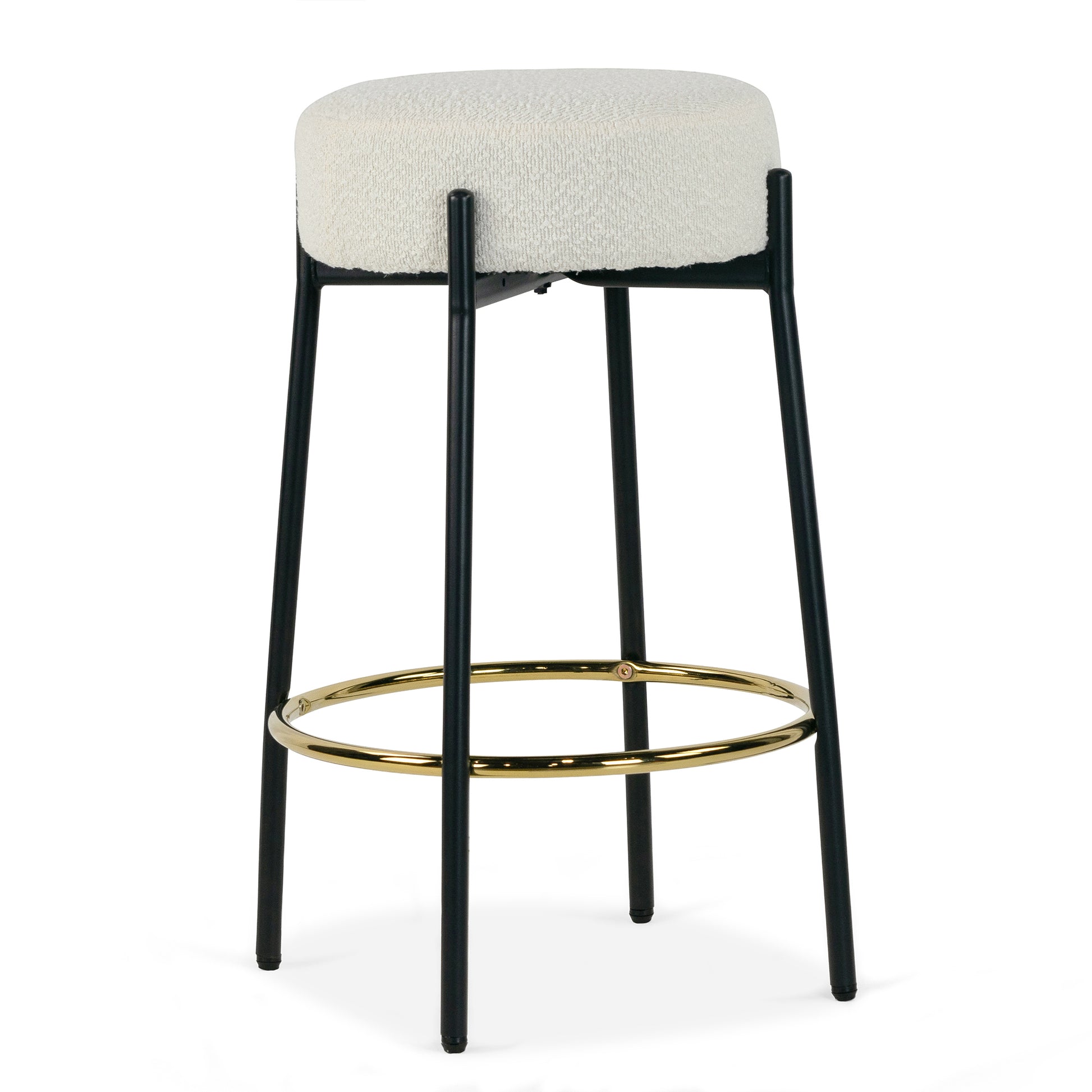 Introducing our Modern Beige Bouclé Counter Stool with Black Legs, a contemporary masterpiece that effortlessly combines comfort and style for your bar or kitchen counter. This counter stool features a sleek and minimalist design with a comfortably cushioned seat upholstered in luxurious beige bouclé fabric, adding a touch of sophistication to your space while inviting you to relax in style. The stool stands on four sturdy black metal legs with a gold footrest, offering both stability and a striking contrast to the soft beige upholstery. Designed for durability and comfort, this counter stool not only elevates your seating experience but also enhances the modern aesthetic of your home, making it a perfect choice for socializing, dining, or simply enjoying a morning coffee at your bar area.