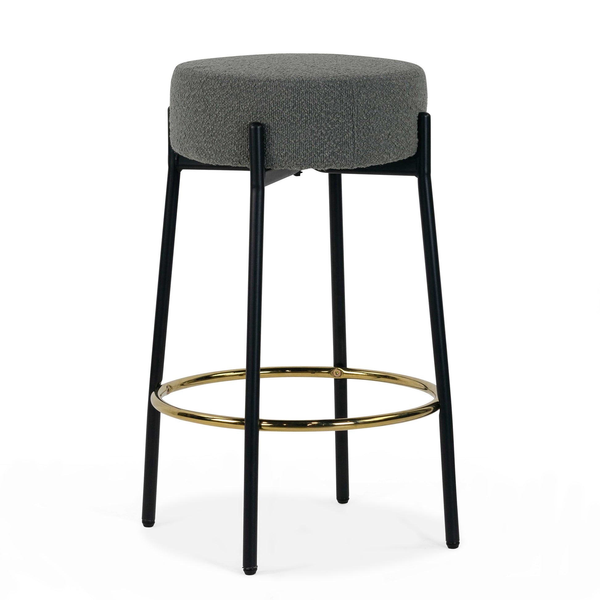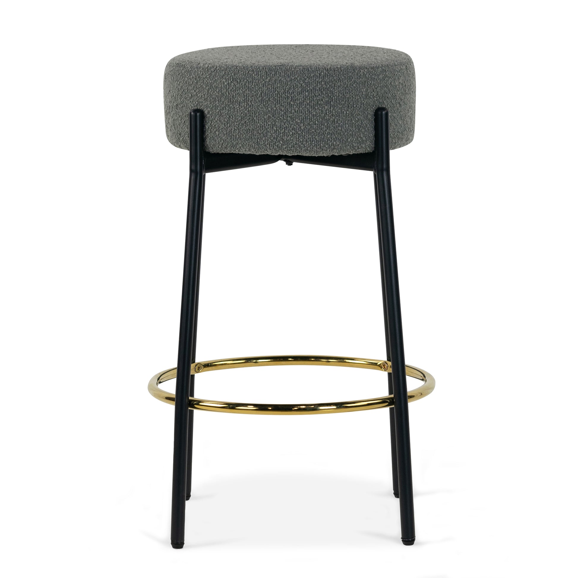 Introducing our Modern Grey Bouclé Counter Stool with Black Legs, a contemporary masterpiece that effortlessly combines comfort and style for your bar or kitchen counter. This counter stool features a sleek and minimalist design with a comfortably cushioned seat upholstered in luxurious grey bouclé fabric, adding a touch of sophistication to your space while inviting you to relax in style. The stool stands on four sturdy black metal legs with a gold footrest, offering both stability and a striking contrast to the soft grey upholstery. Designed for durability and comfort, this counter stool not only elevates your seating experience but also enhances the modern aesthetic of your home, making it a perfect choice for socializing, dining, or simply enjoying a morning coffee at your bar area.