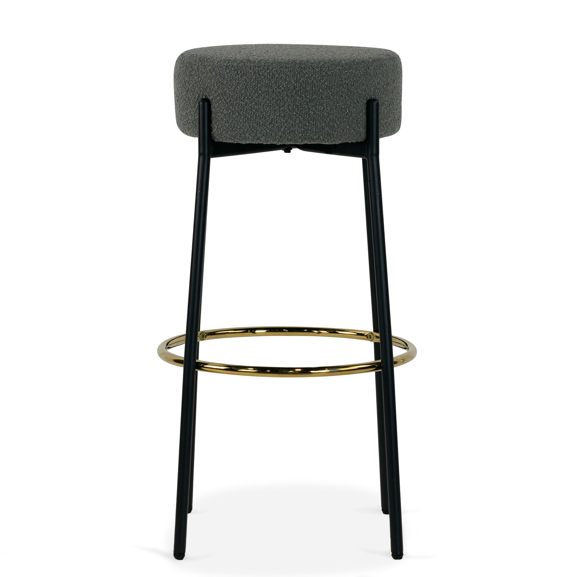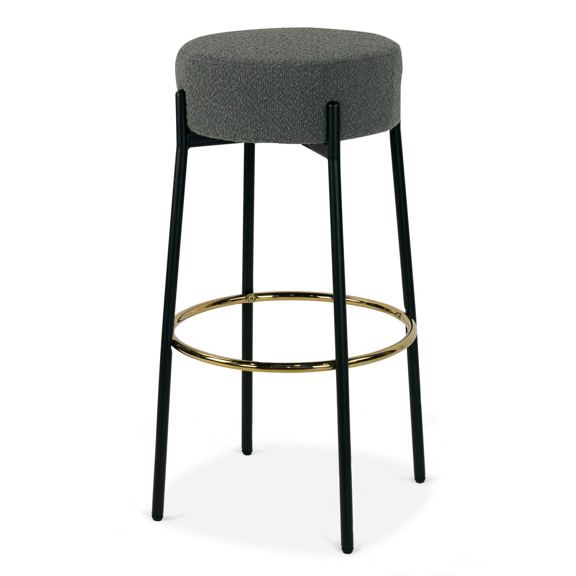 Introducing our Modern Grey Bouclé Bar Stool with Black Legs, a contemporary masterpiece that effortlessly combines comfort and style for your bar or kitchen counter. This bar stool features a sleek and minimalist design with a comfortably cushioned seat upholstered in luxurious grey bouclé fabric, adding a touch of sophistication to your space while inviting you to relax in style. The stool stands on four sturdy black metal legs with a gold footrest, offering both stability and a striking contrast to the soft grey upholstery. Designed for durability and comfort, this bar stool not only elevates your seating experience but also enhances the modern aesthetic of your home, making it a perfect choice for socializing, dining, or simply enjoying a morning coffee at your bar area.