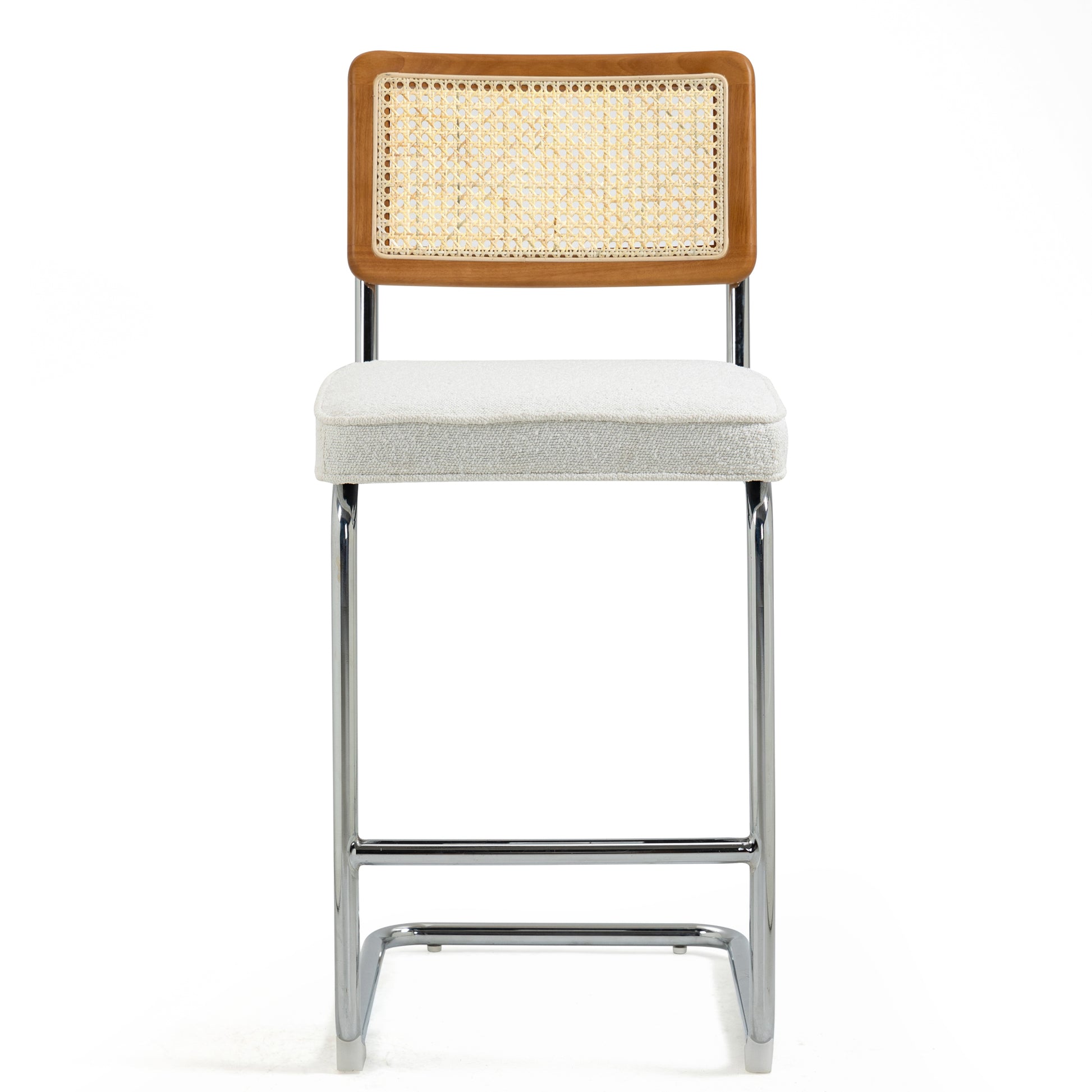 Set of 2 Ayers White Boucle Fabric Counter Stool with Rattan Backrest and Chrome Legs