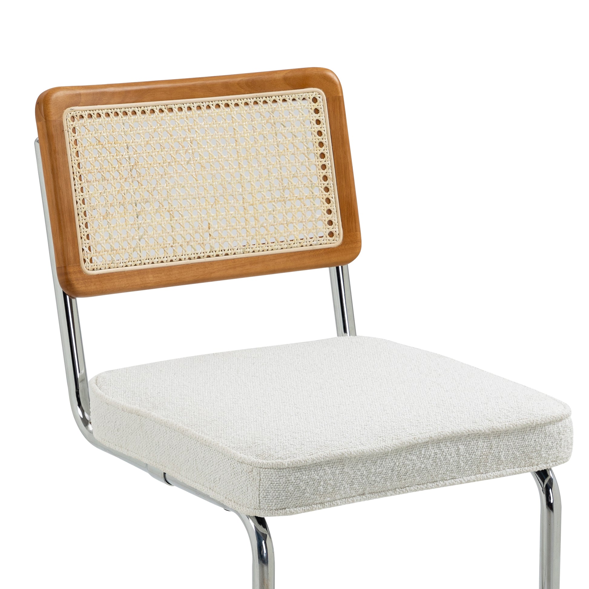 Upgrade your kitchen or bar area with our elegant white bouclé fabric counter stool. Featuring a distinctive rattan backrest that adds a touch of natural charm, it offers both style and comfort. The chrome legs provide stability and a modern edge, creating a harmonious blend of materials. This counter stool is the perfect choice to enhance your space with a unique, versatile design.