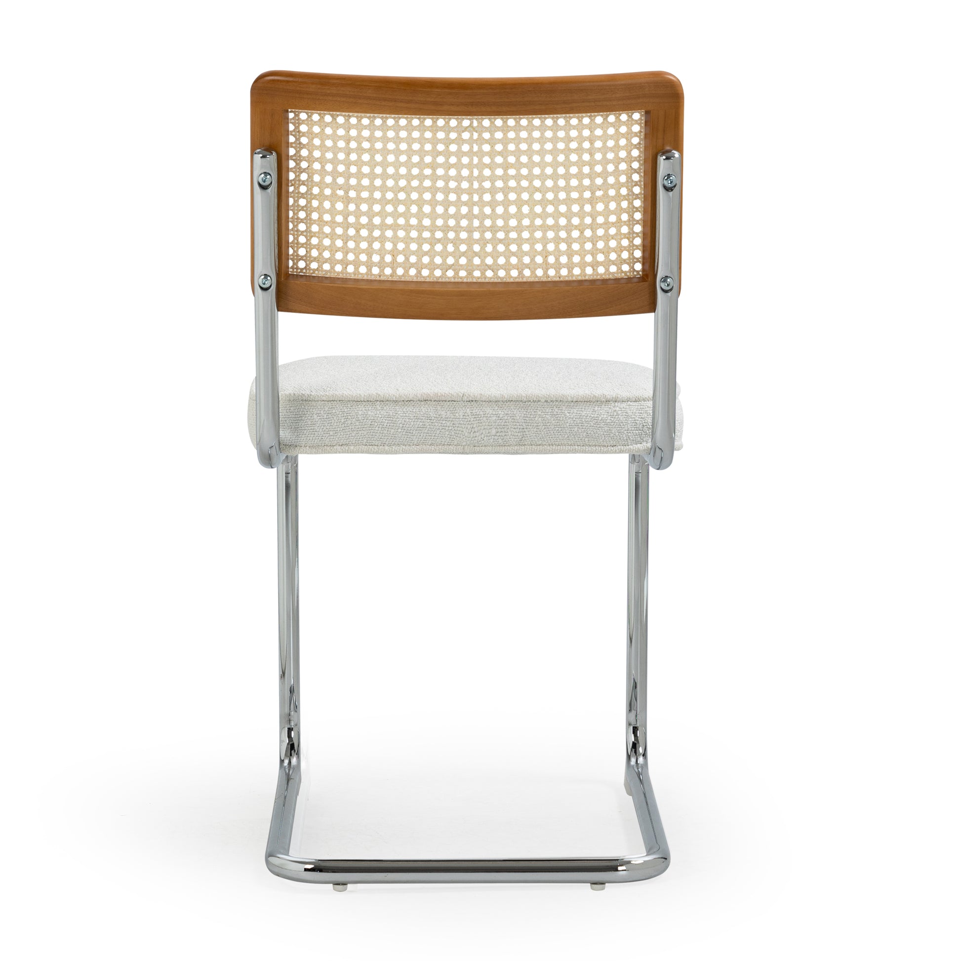 Enhance your dining experience with our white bouclé dining chair. This stylish chair features a unique rattan backrest that adds a touch of natural charm and elegance to your dining space. Its sleek chrome legs provide stability and a modern edge. Embrace both comfort and contemporary design as you dine in style with this exquisite chair that blends the best of classic and modern aesthetics.