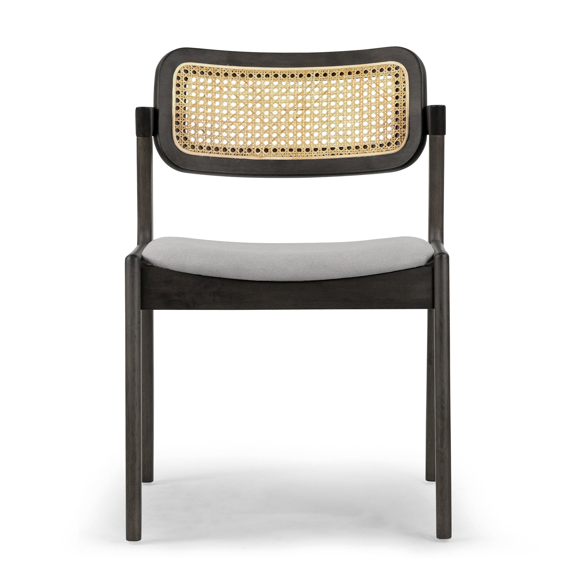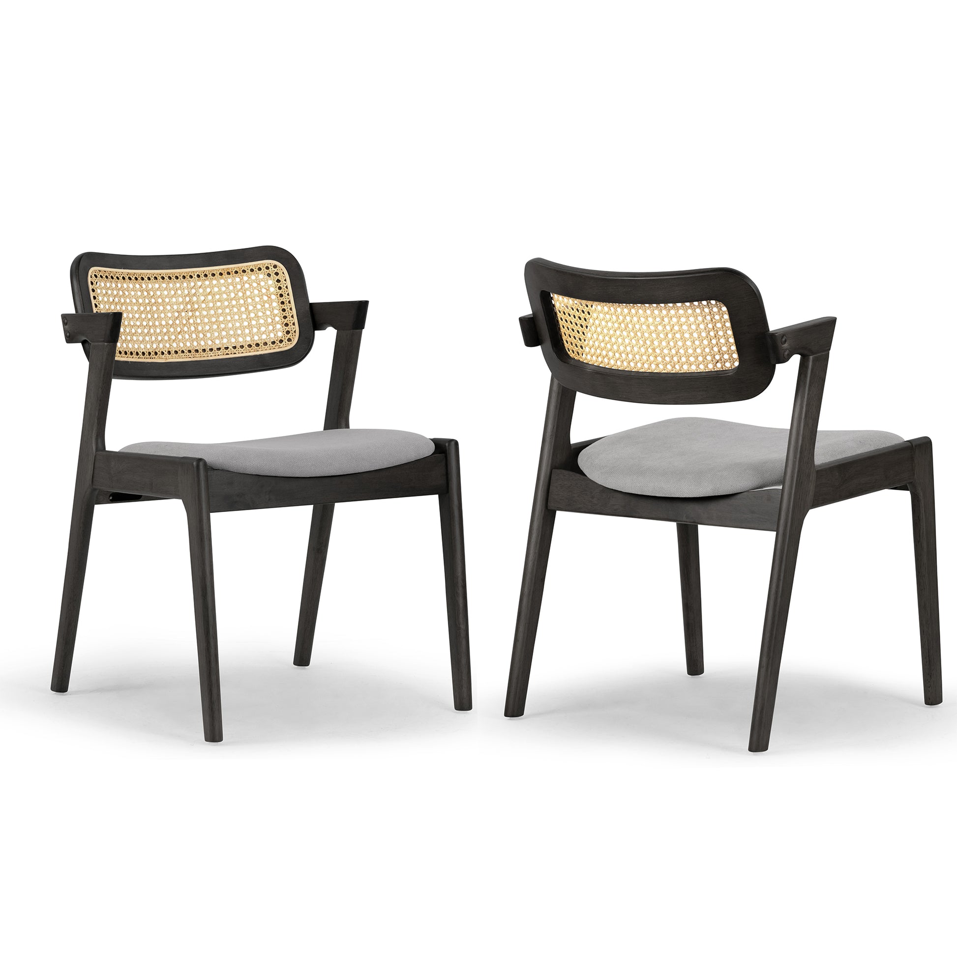 Set of 2 Azula Gray Fabric Dining Chair with Rattan Back and Black Wood Legs