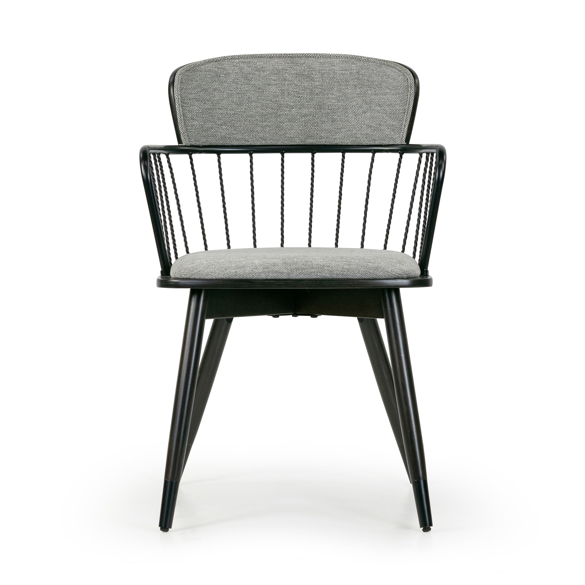Elevate your dining experience with our gray dining chair. Featuring a sophisticated iron slated accent back, this chair seamlessly blends style and comfort. The sleek gray upholstery adds a touch of modern elegance, while sturdy dark walnut wood legs provide stability and durability. Make a statement in your dining space with this chic and versatile seating option.
