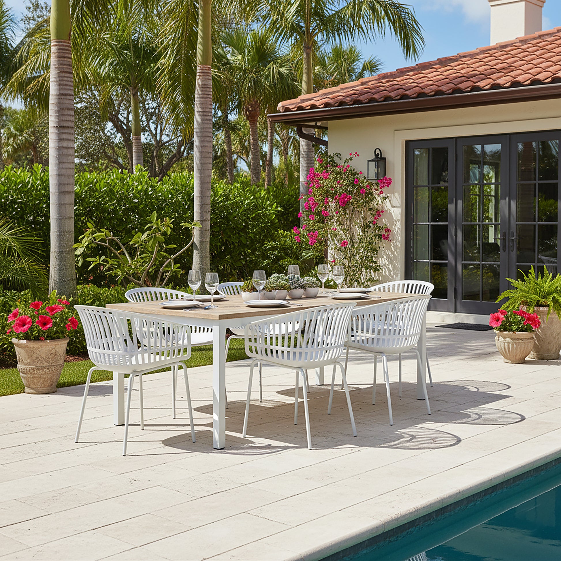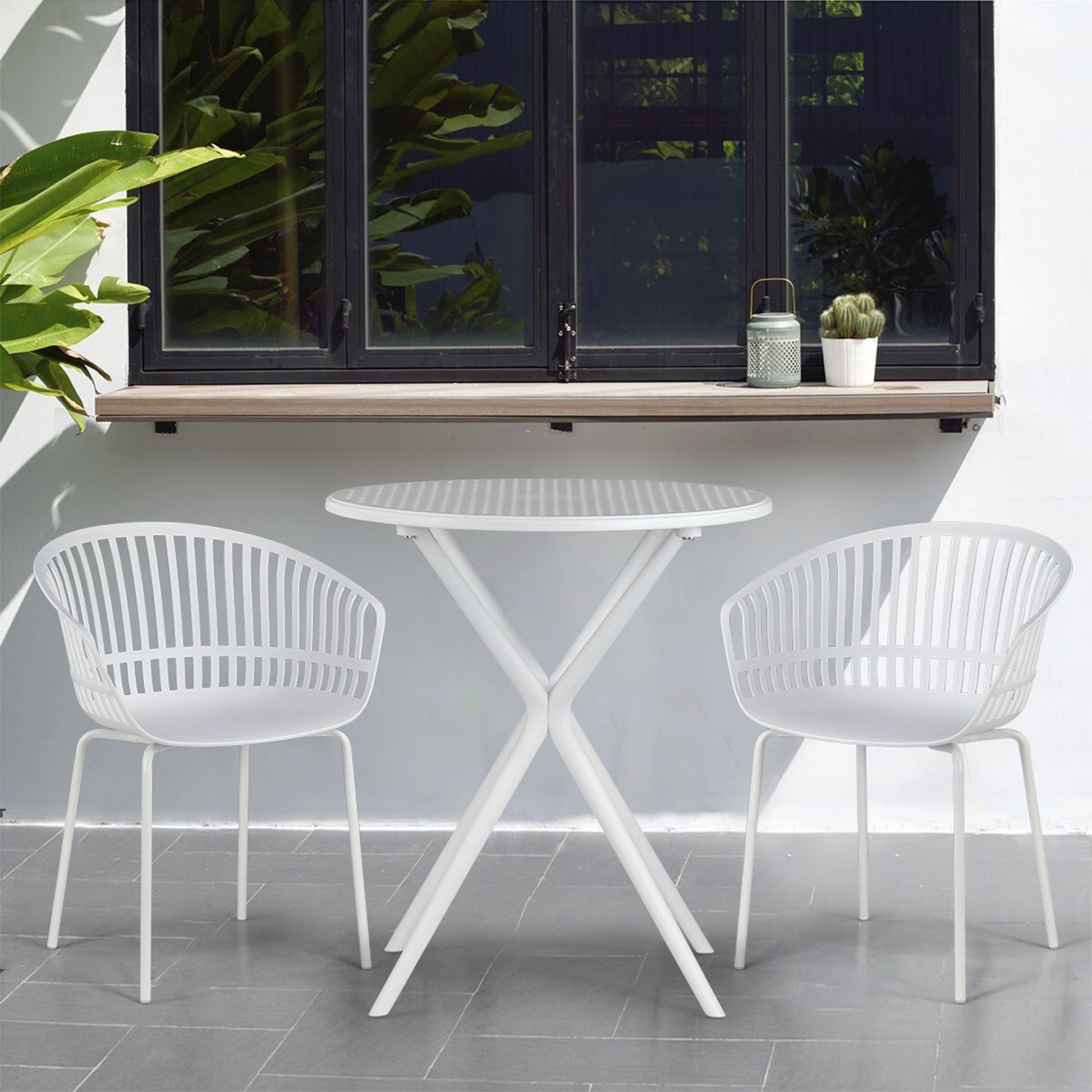 Elevate your outdoor dining experience with our white plastic dining chairs. Featuring a stylish slatted back design and sturdy iron legs, these chairs blend functionality with modern aesthetics. Built to withstand outdoor elements, they offer both durability and comfort, making them the perfect choice for your patio or garden gatherings. Enjoy al fresco dining in style and ease.