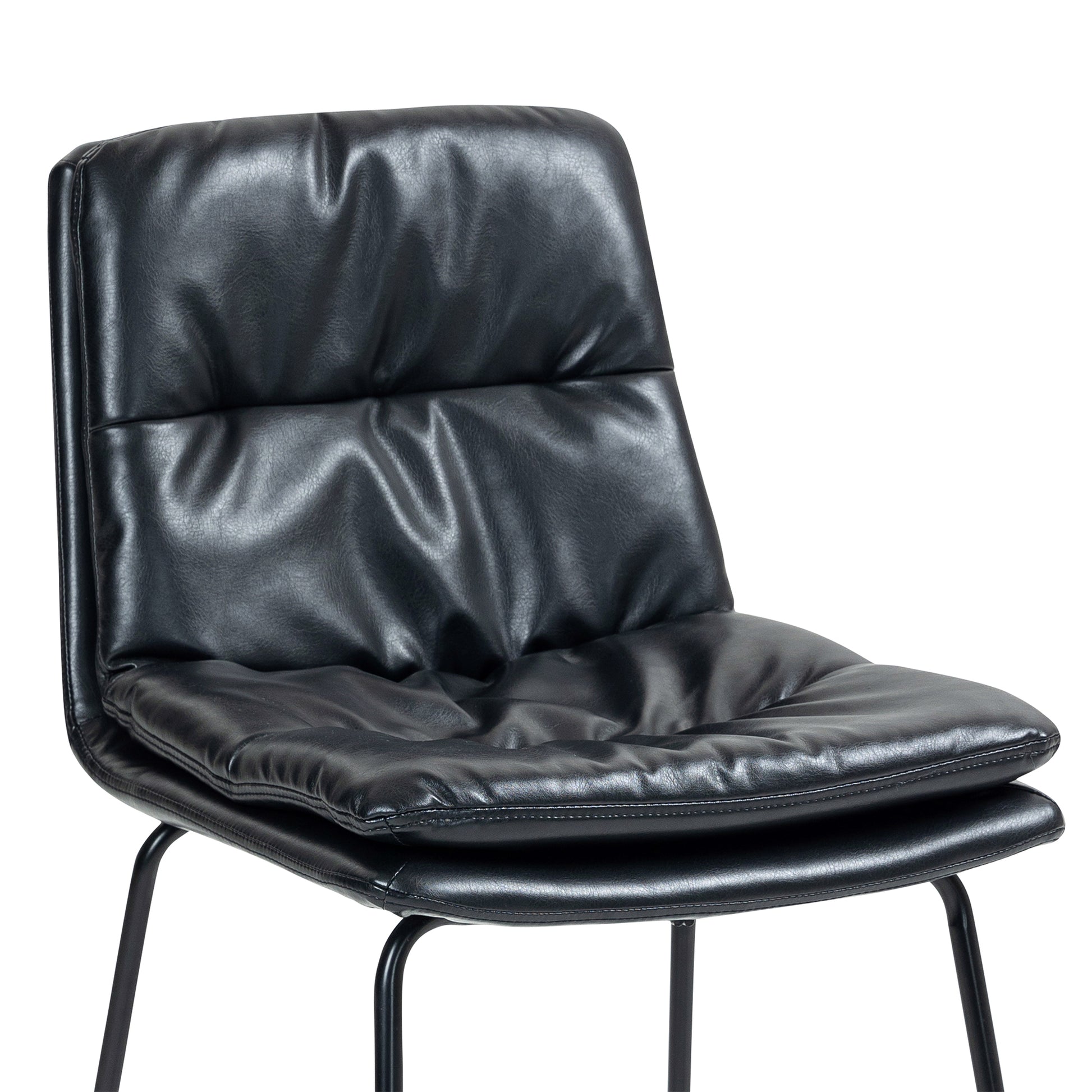 Experience elevated seating with our black faux leather bar stool, a perfect fusion of style and functionality. The sleek design is complemented by durable black iron legs, ensuring stability and a touch of industrial charm. Enjoy added comfort with a strategically placed footrest, making it an ideal choice for both contemporary and classic bar settings. Redefine your bar area with this chic and practical seating solution.