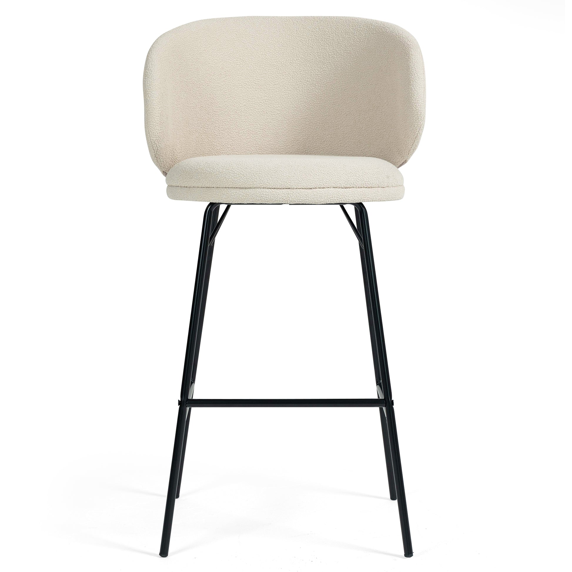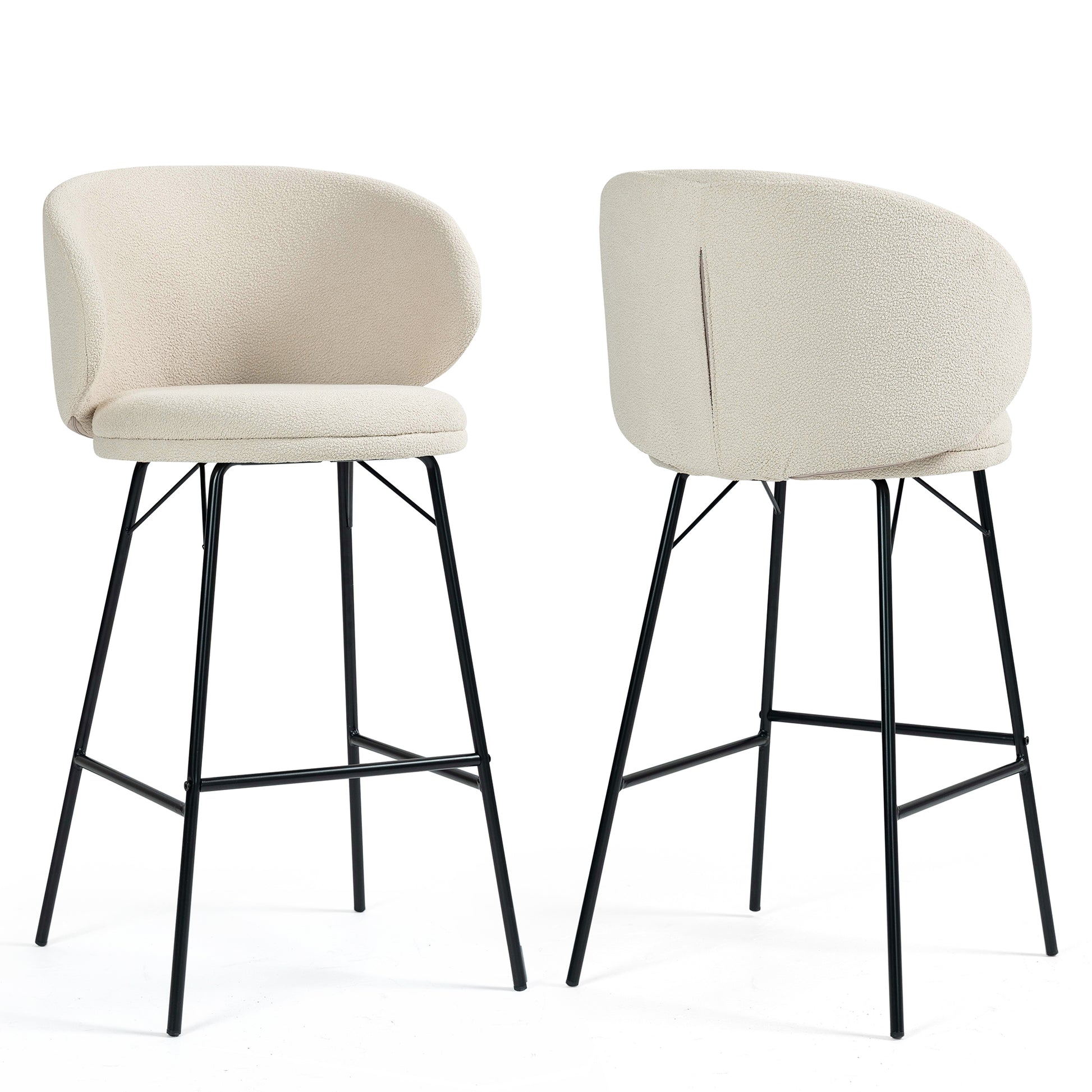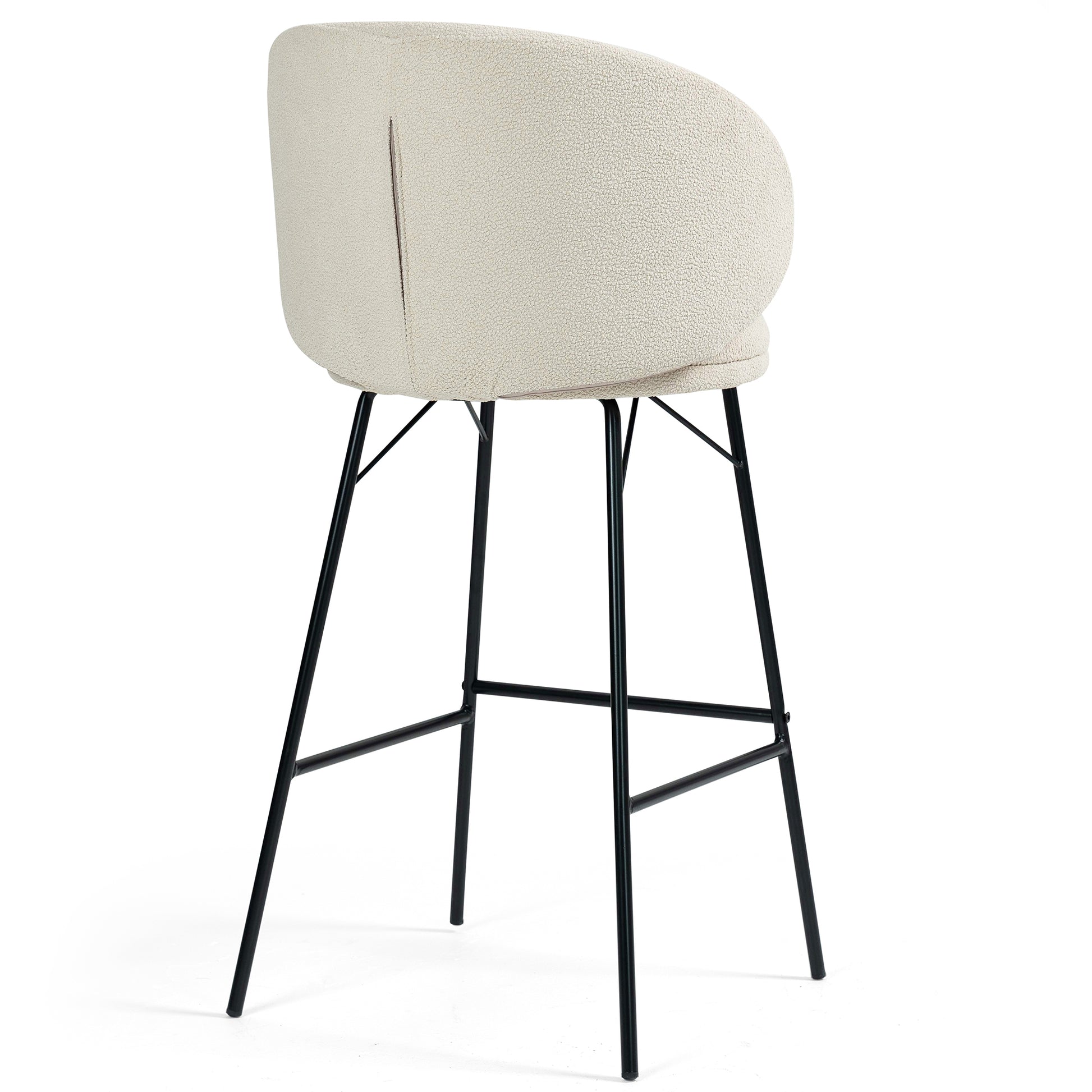 Elevate your bar experience with our stylish white bouclé fabric bar stool. The soft, textured upholstery adds a touch of elegance, while the sturdy black iron legs provide stability and modern flair. Enjoy maximum comfort with a convenient footrest, enhancing your relaxation. Whether for casual gatherings or formal occasions, this chic stool effortlessly combines comfort and sophistication, perfect for any contemporary space.
