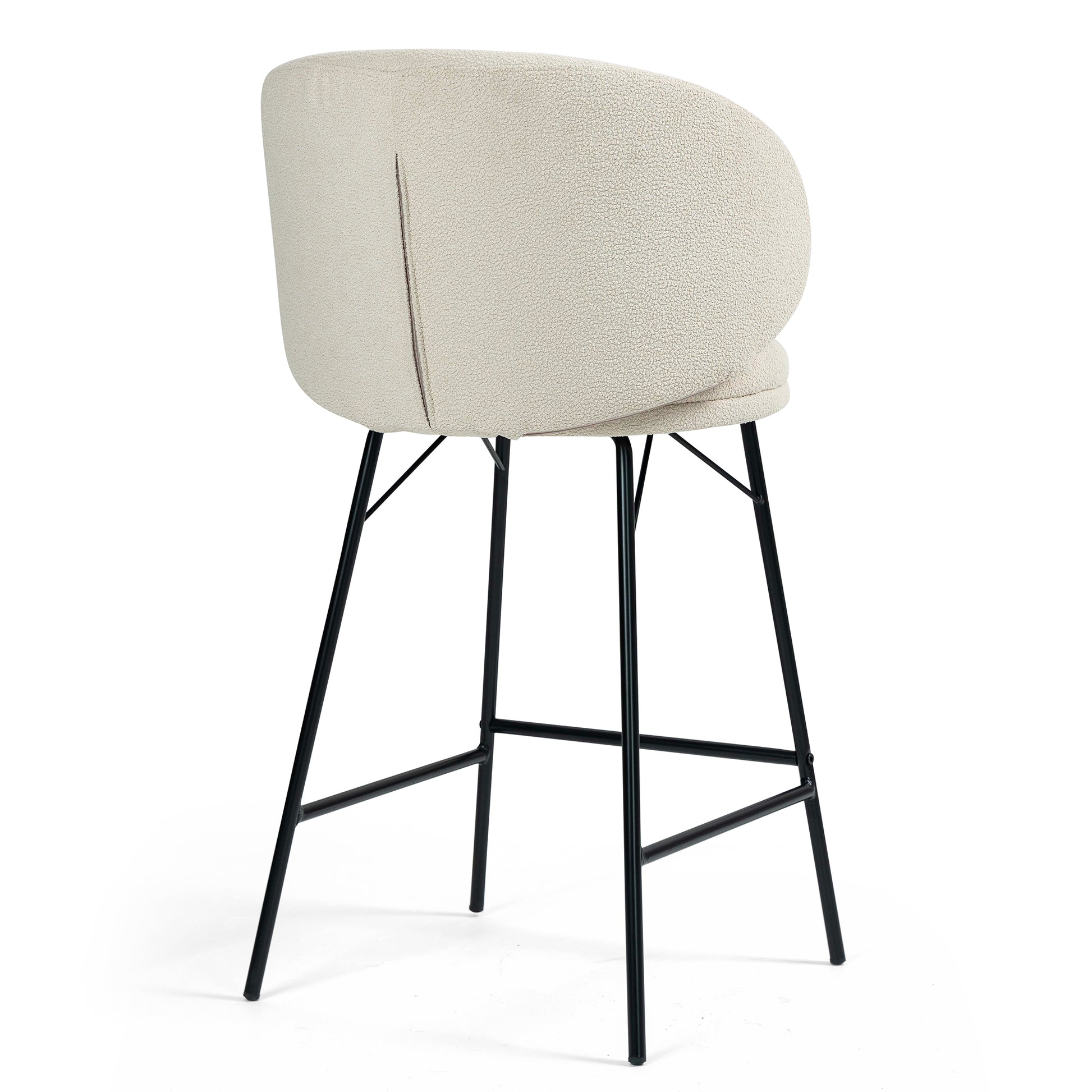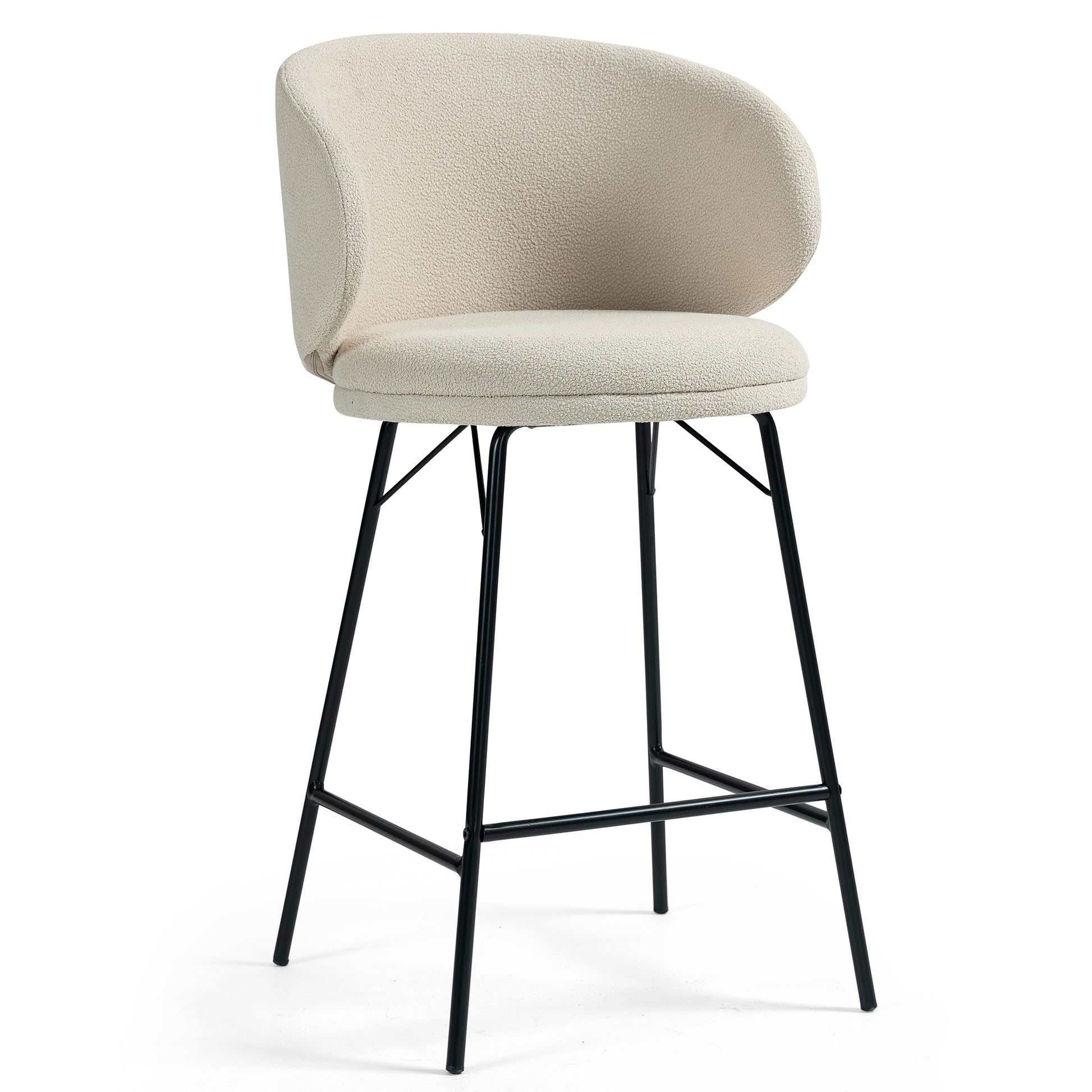 Elevate your bar experience with our stylish white bouclé fabric counter stool. The soft, textured upholstery adds a touch of elegance, while the sturdy black iron legs provide stability and modern flair. Enjoy maximum comfort with a convenient footrest, enhancing your relaxation. Whether for casual gatherings or formal occasions, this chic stool effortlessly combines comfort and sophistication, perfect for any contemporary space.