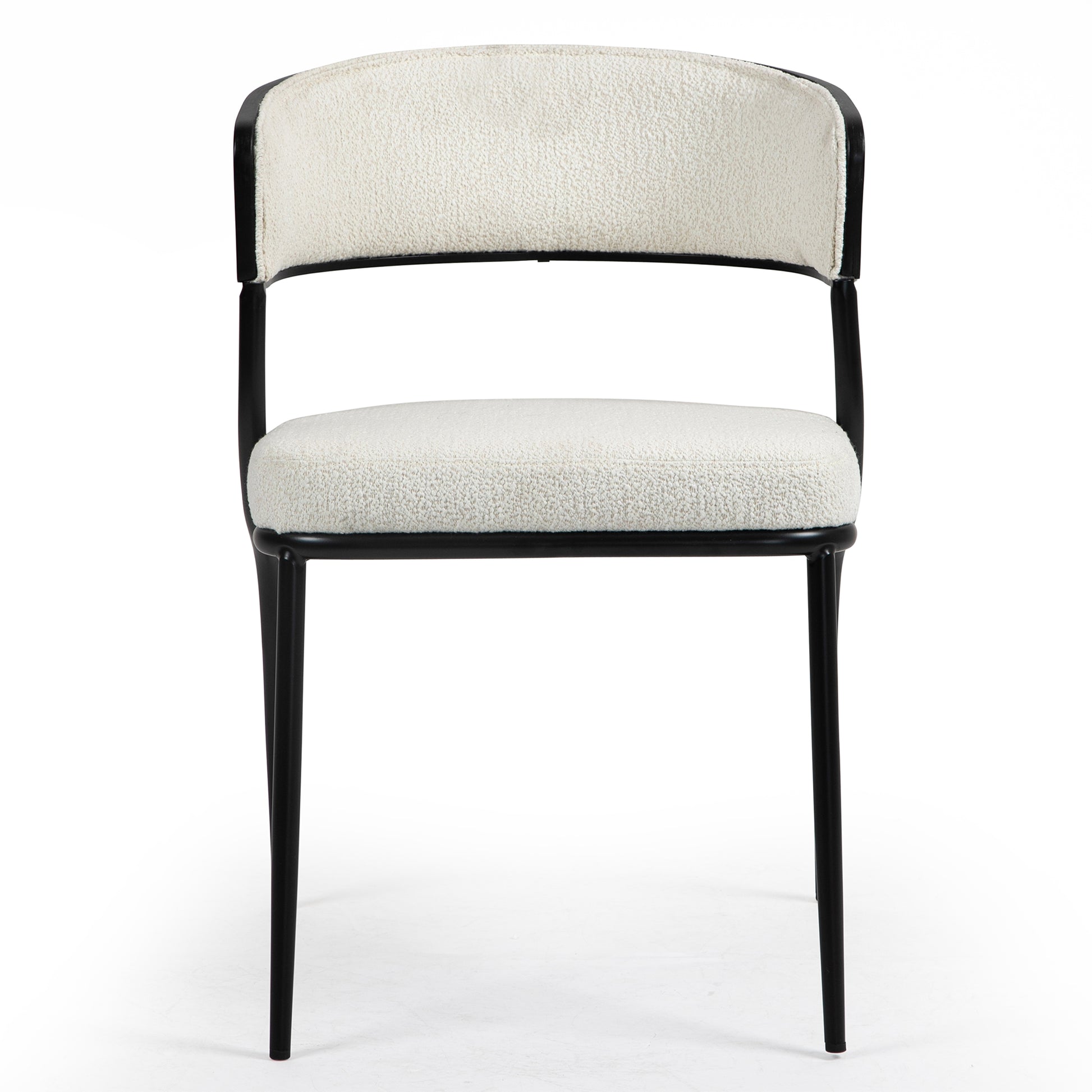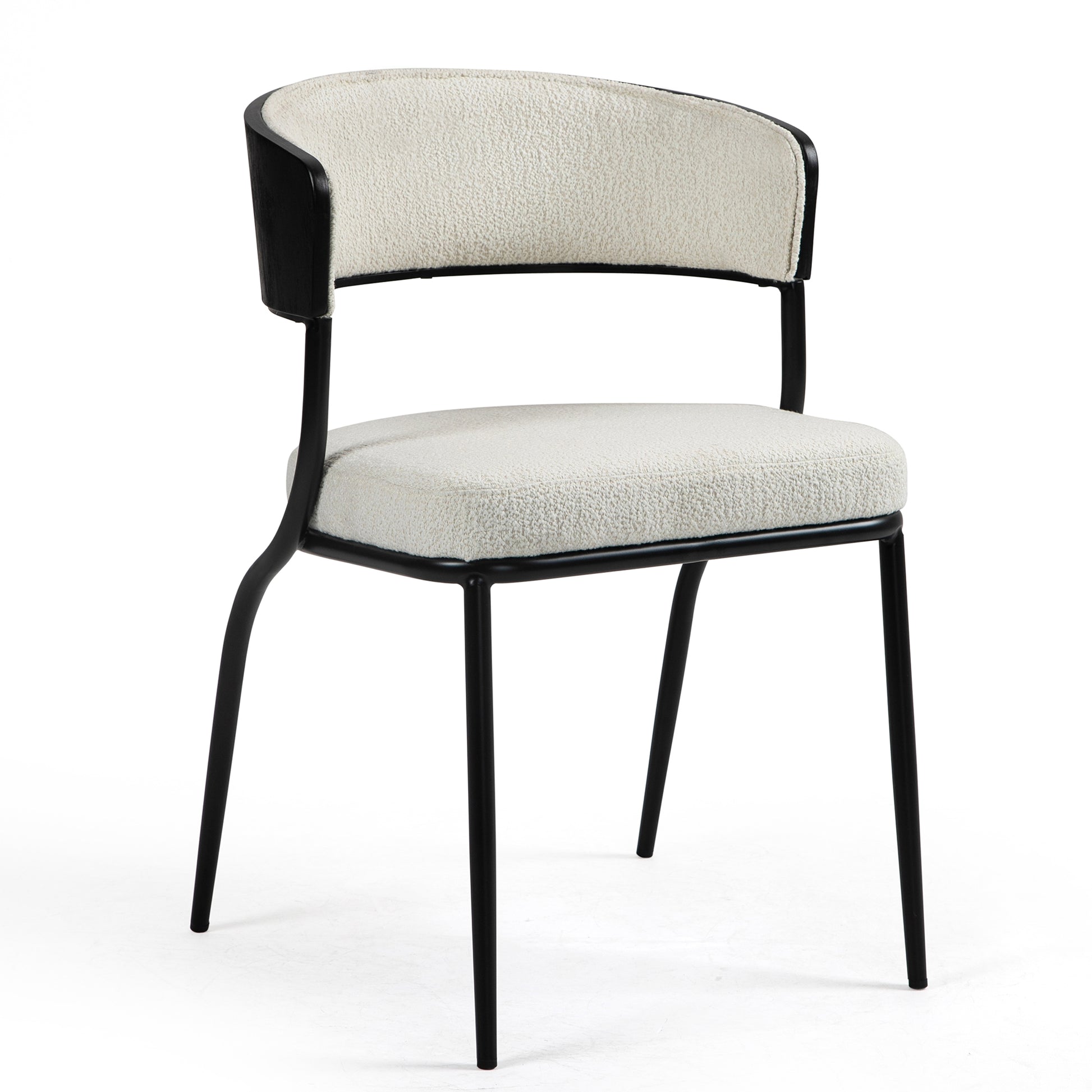 Elevate your dining experience with our chic white bouclé dining chair featuring sleek black iron legs for a contemporary edge. Luxuriously soft and stylishly textured, the bouclé upholstery adds tactile charm while the black accent legs provide a bold contrast. Enjoy comfort and sophistication in every meal with this elegant addition to your dining space.