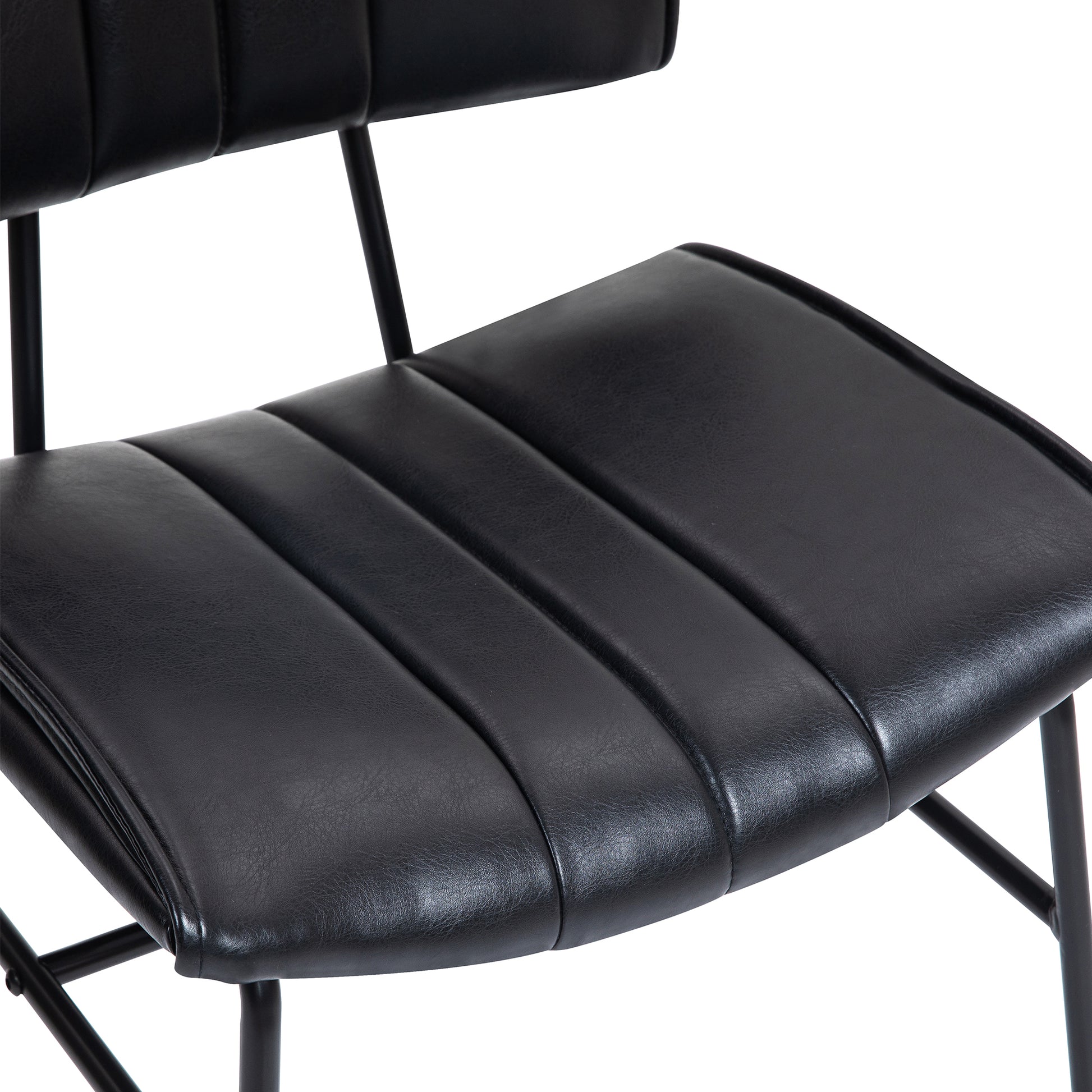 Introduce timeless elegance to your dining area with our black faux leather dining chair. Its sleek silhouette is complemented by black metal accent legs, marrying classic charm with mid-century modern flair. Sink into luxurious comfort as you dine, thanks to its plush cushioning and ergonomic design. Versatile and stylish, this chair is the perfect addition to any contemporary or traditional setting, elevating your dining experience with every use.