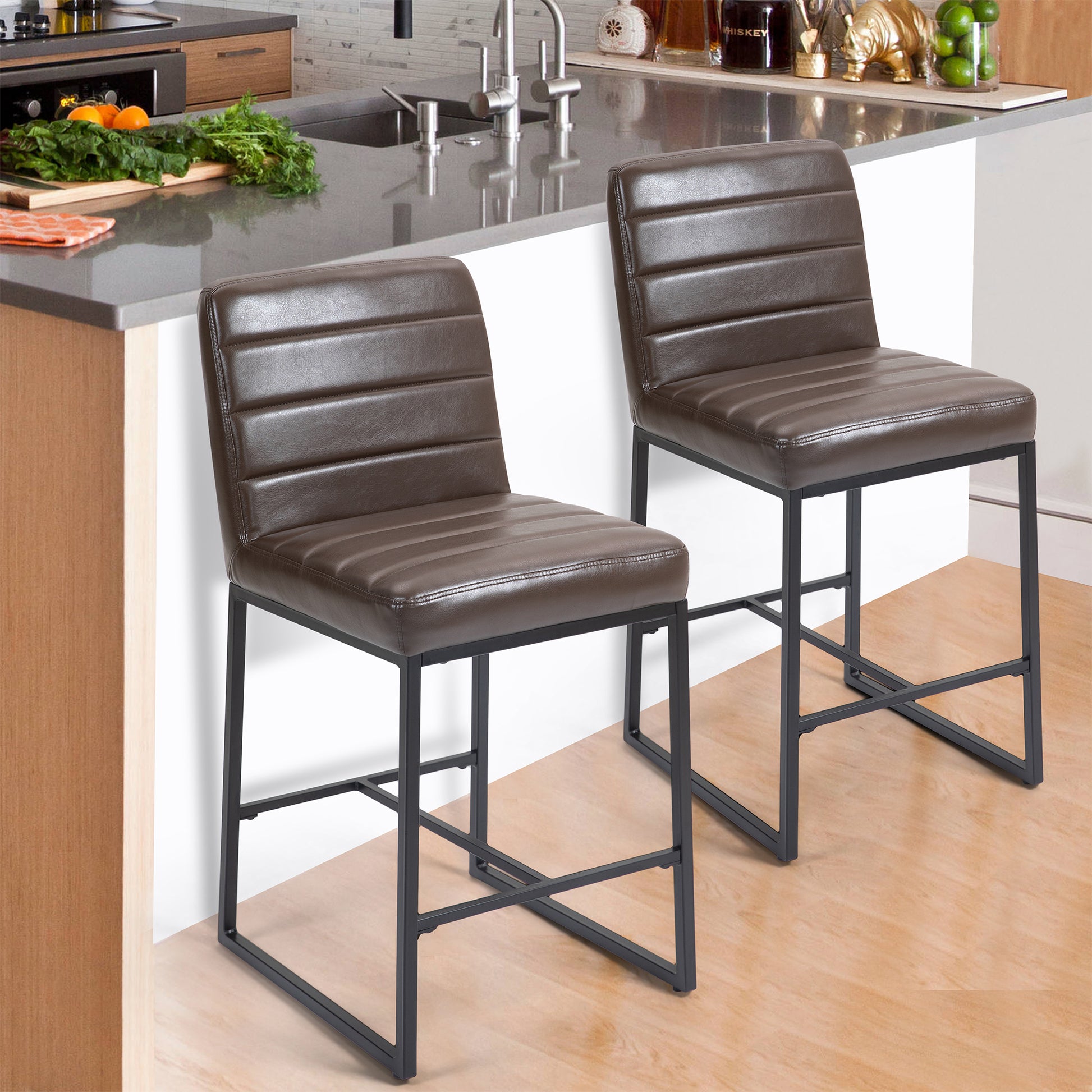 Set of 2 Belisario Brown Faux Leather Counter Stool with Black Metal Legs