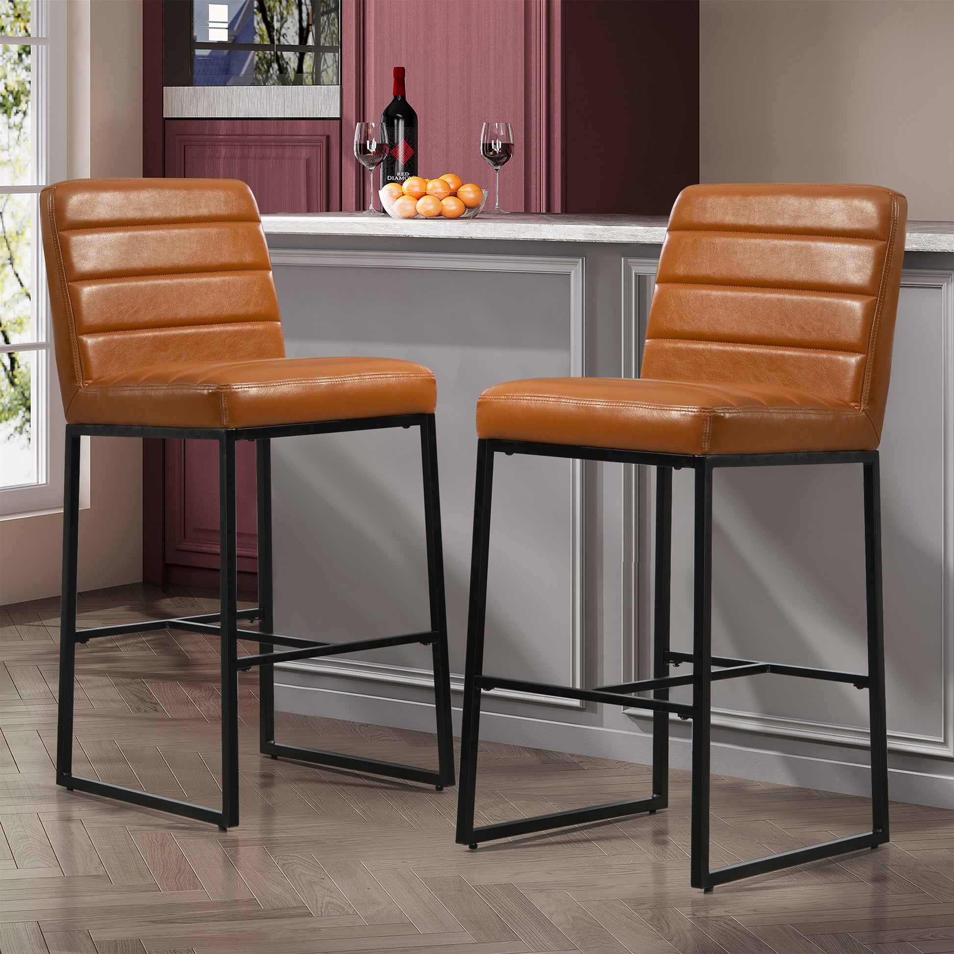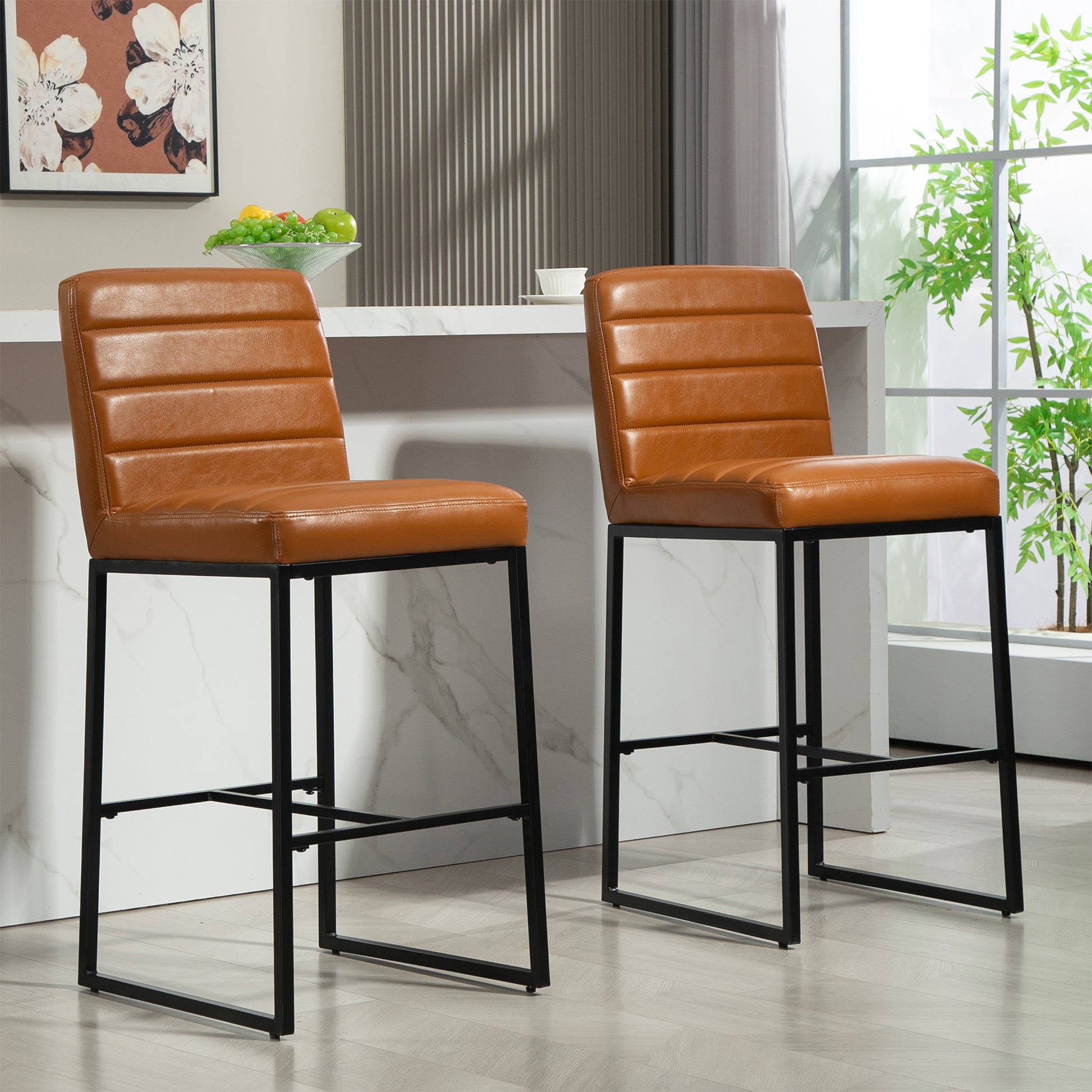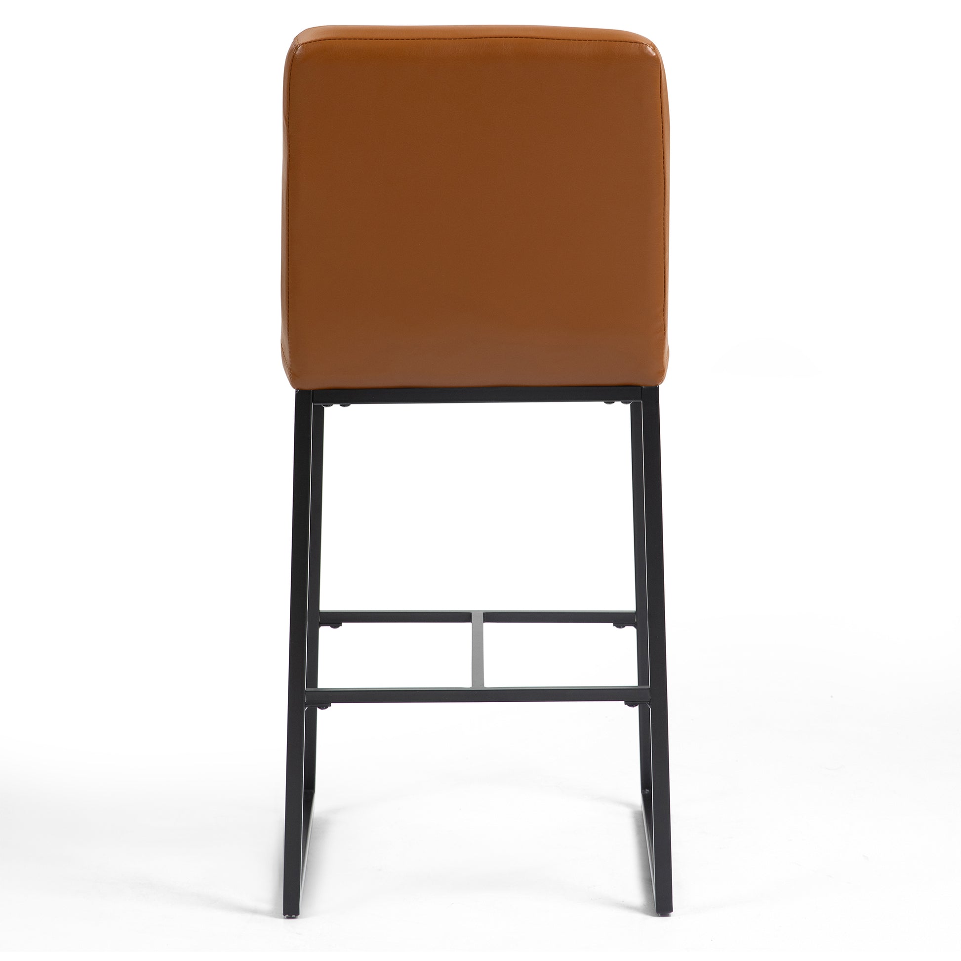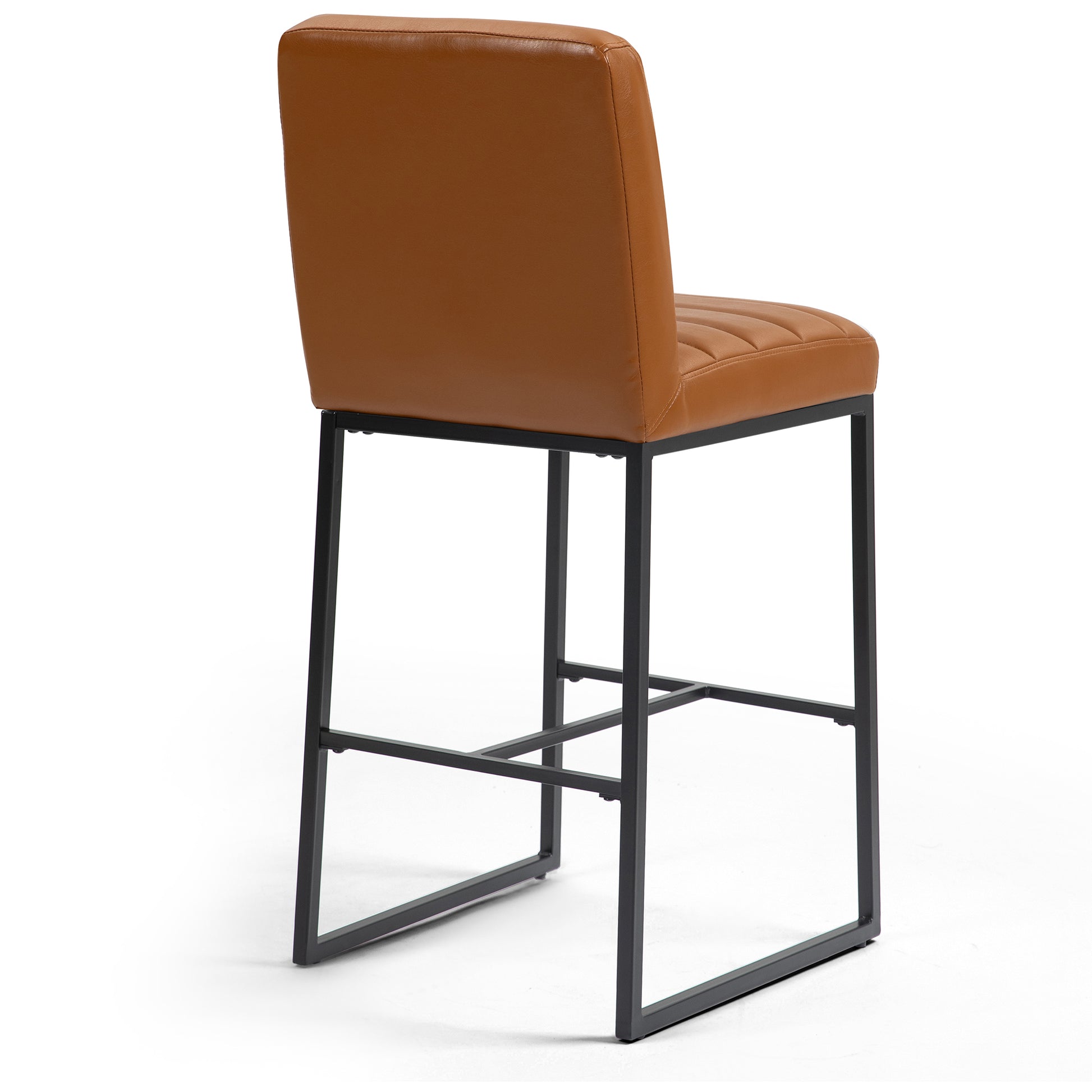 Experience elevated seating with our light brown faux leather bar stool, a perfect fusion of style and functionality. The sleek design is complemented by durable black iron legs, ensuring stability and a touch of industrial charm. Enjoy added comfort with a strategically placed footrest, making it an ideal choice for both contemporary and classic bar settings. Redefine your bar area with this chic and practical seating solution.