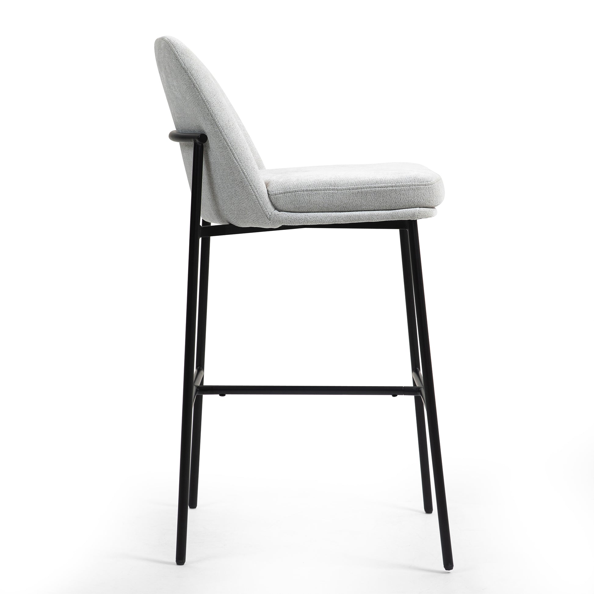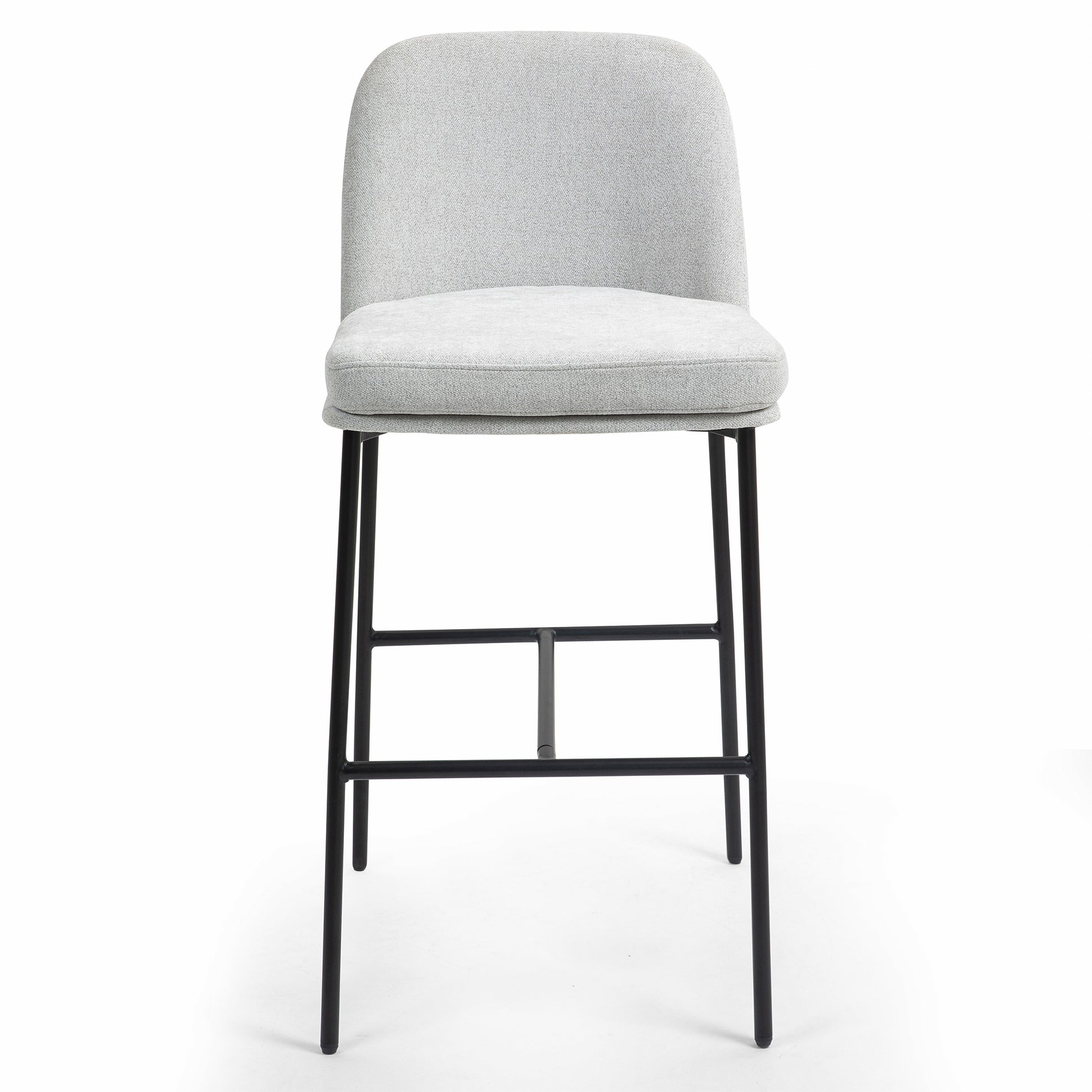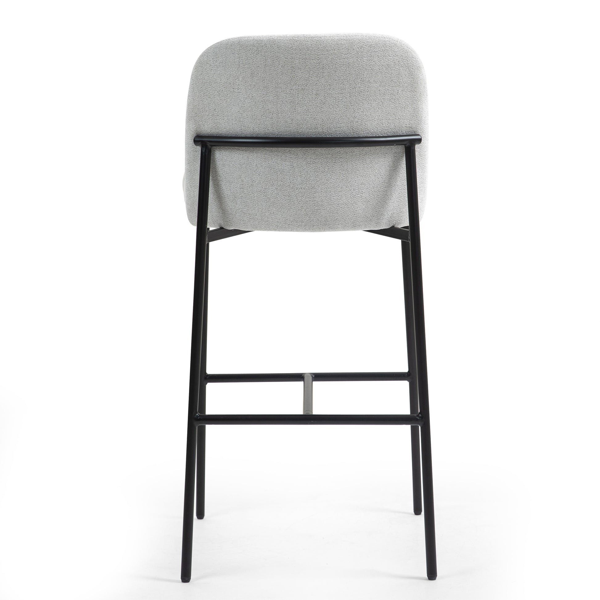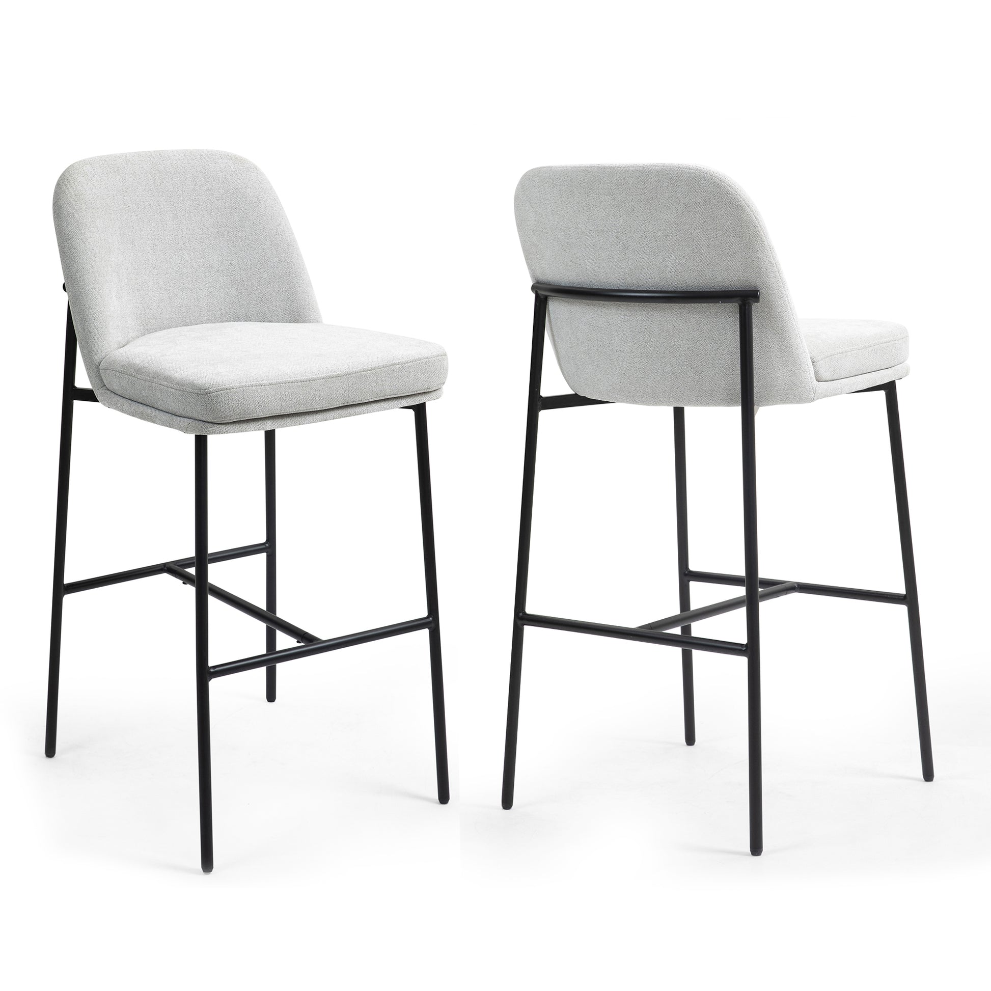 Elevate your space with our chic gray upholstered fabric bar stool. Its sleek design boasts contrasting black iron legs, providing both style and stability. Enjoy comfort with a plush seat and a convenient black footrest for added support. Perfect for any modern kitchen or bar, this stool effortlessly combines sophistication with functionality.