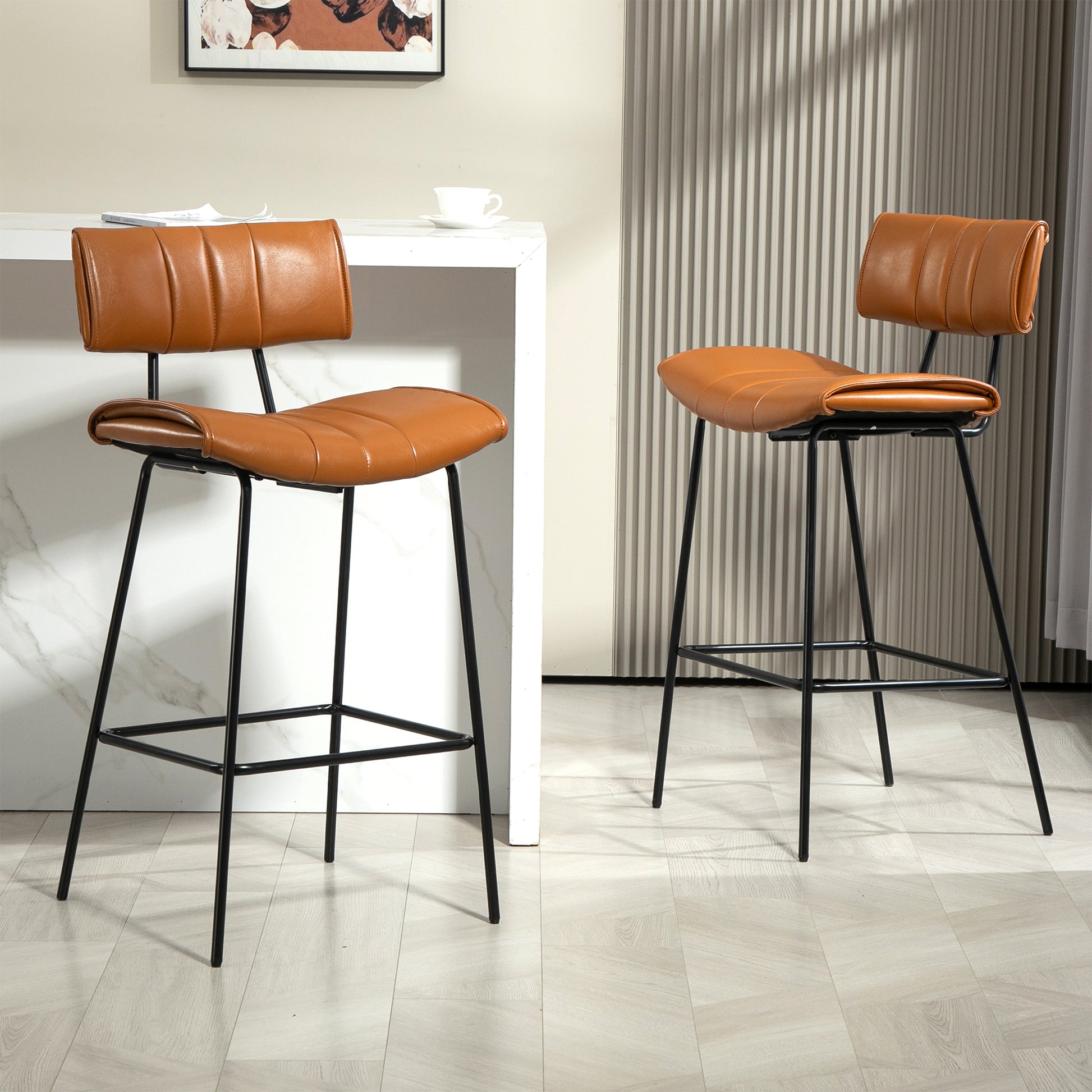 Experience elevated seating with our brown faux leather bar stool, a perfect fusion of style and functionality. The sleek design is complemented by durable black iron legs, ensuring stability and a touch of mid-century modern charm. Enjoy added comfort with a strategically placed footrest, making it an ideal choice for both contemporary and classic bar settings. Redefine your bar area with this chic and practical seating solution.