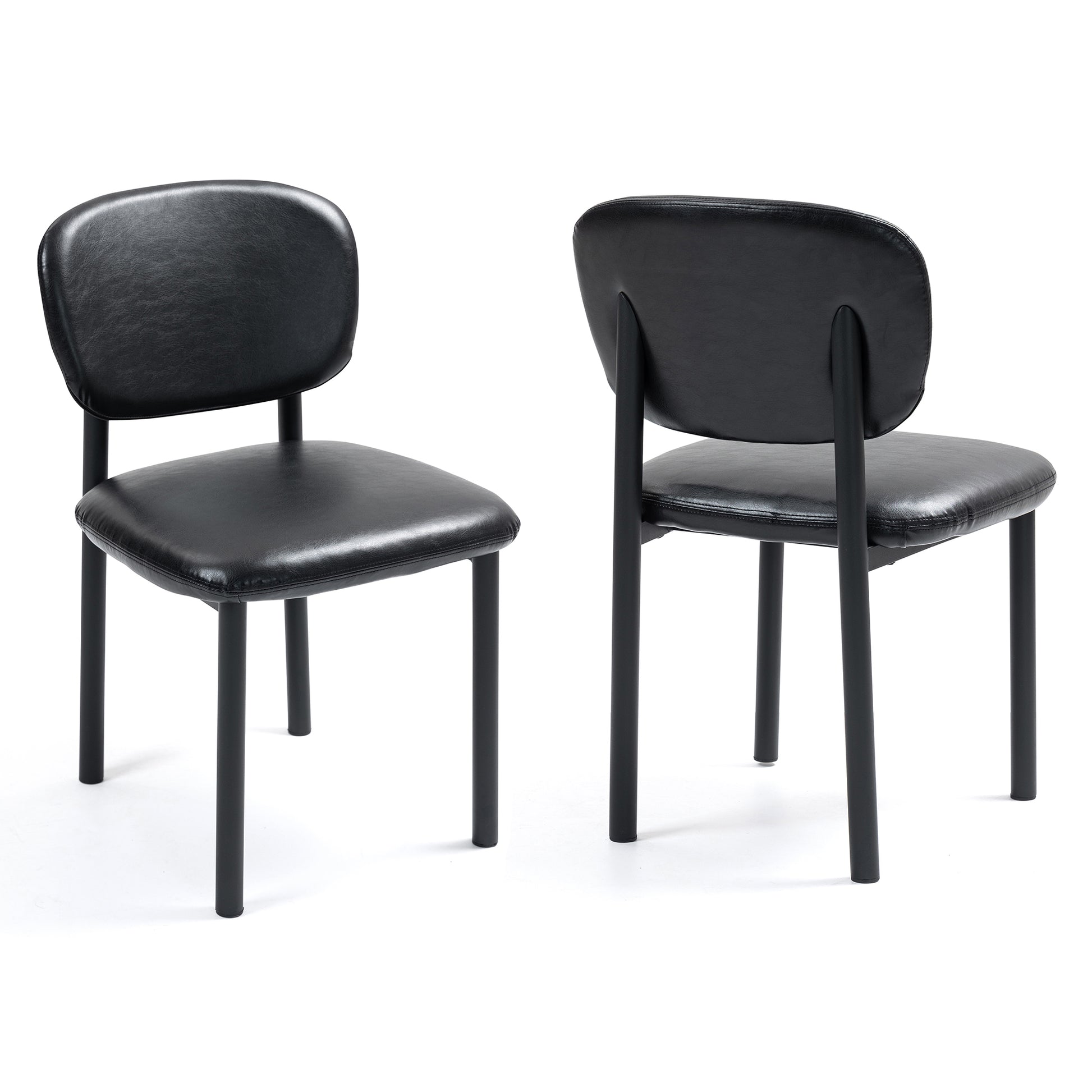 Elevate your dining experience with our black faux leather dining chairs featuring a luxurious and easy-to-clean upholstery. The sleek and modern design is complemented by sturdy iron legs, ensuring durability and style. Perfect for both formal dinners and casual gatherings, these chairs seamlessly blend comfort and sophistication in any dining space.