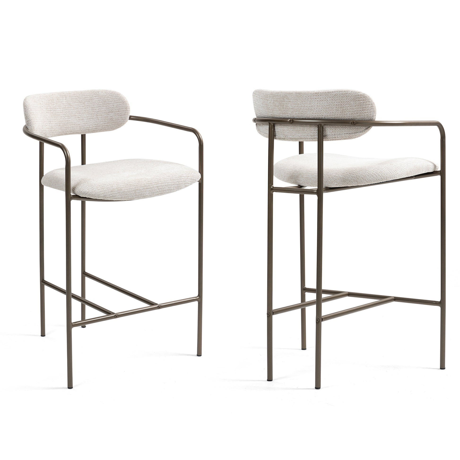 Set of 2 Berker Beige Woven Upholstered Fabric Counter Stool with Brown Iron Arms and Legs