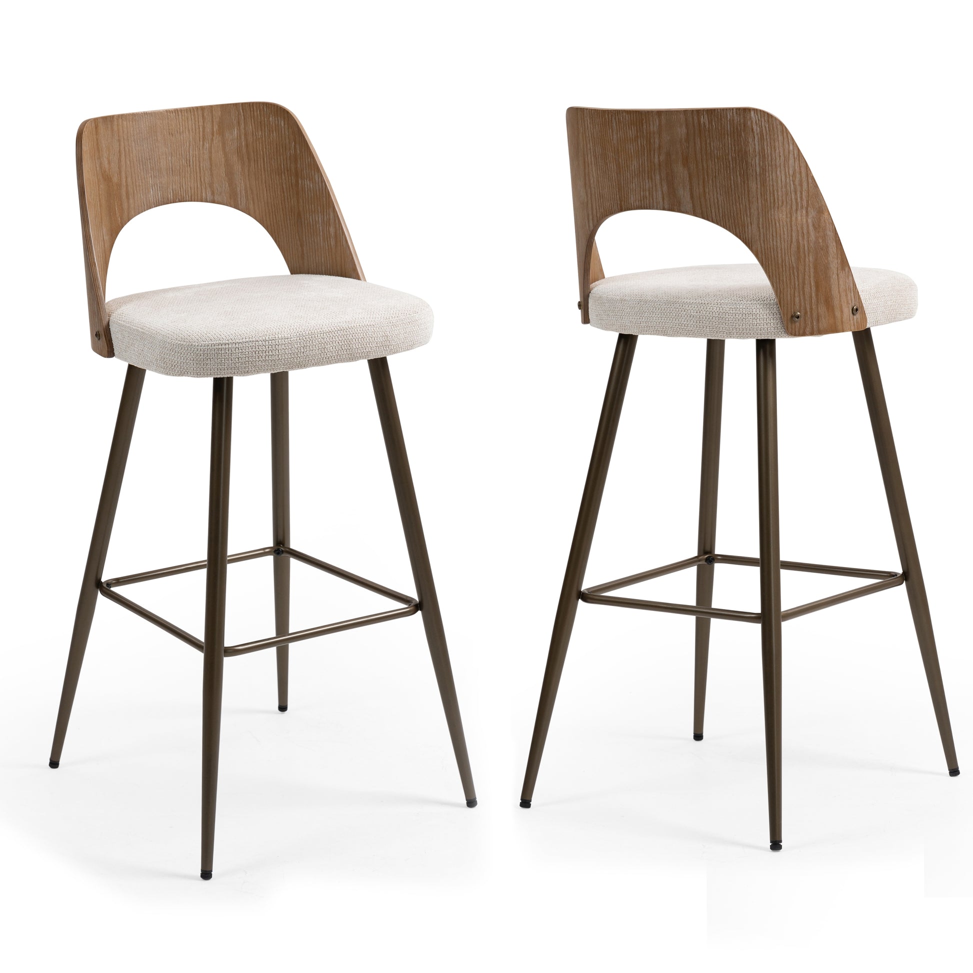 Set of 2 Bethan Beige Washed Boucle Fabric Bar Stool with White Washed Wood Back and Black Iron Legs