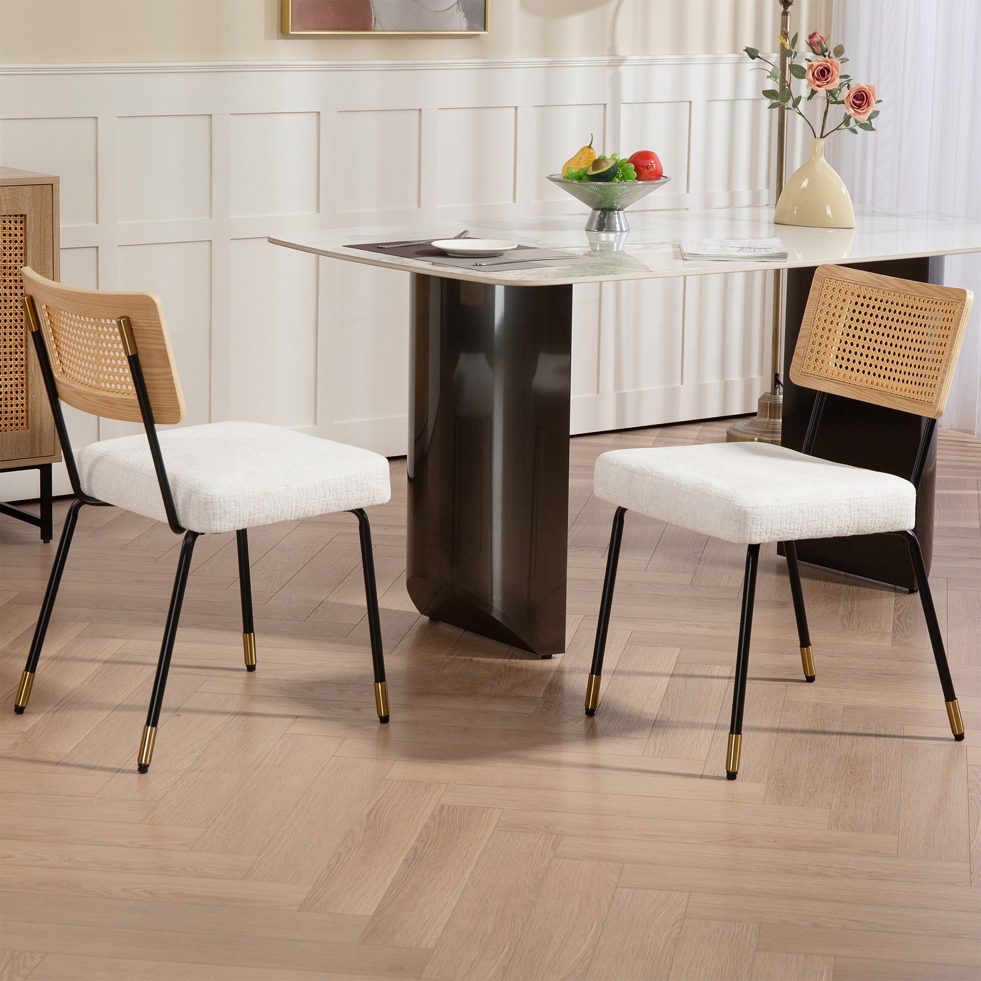Set of 2 Bethari Beige Woven Fabric Dining Chair with Rattan Backrest and Black Iron Legs with Gold Accents