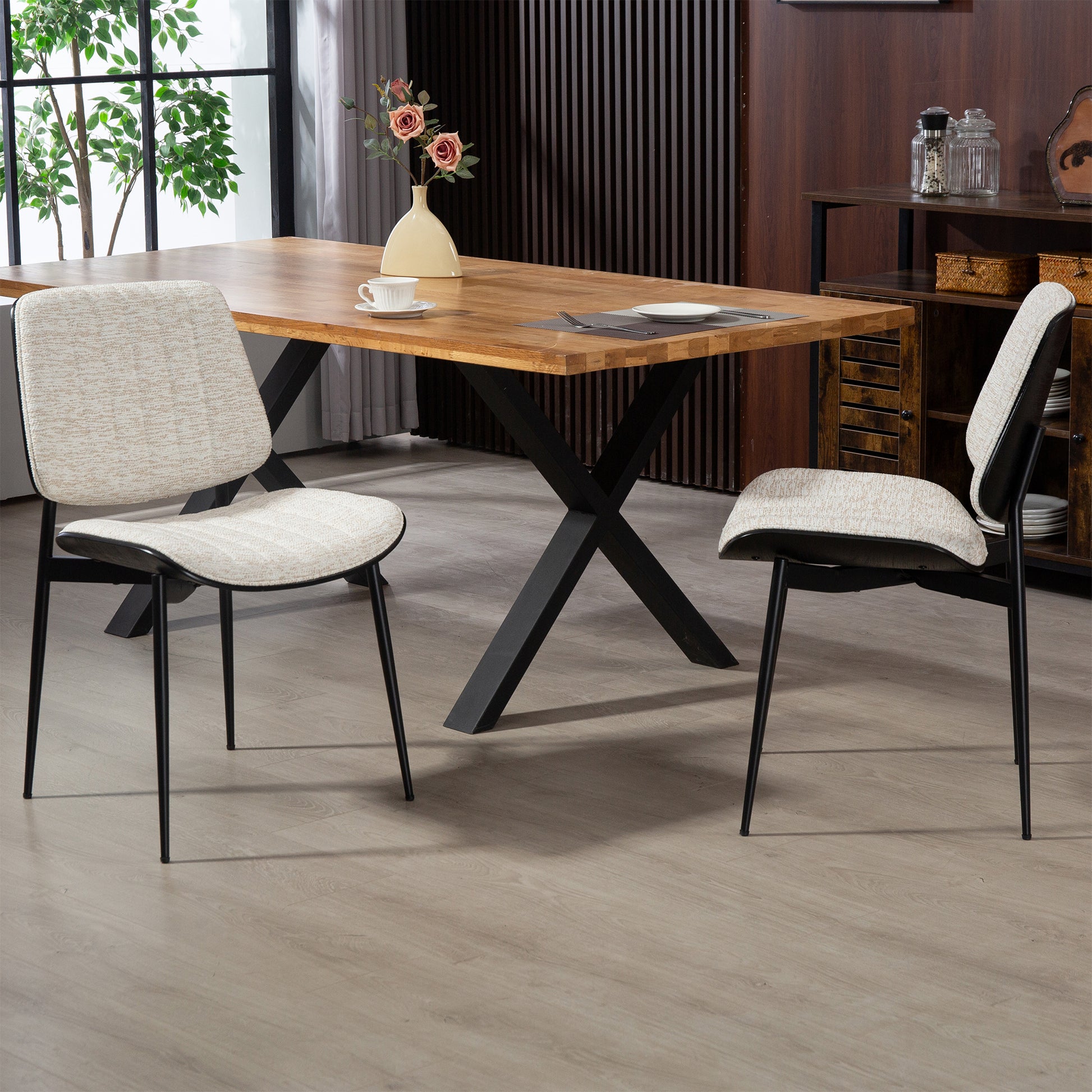 Set of 2 Bethwyn Beige Woven Fabric Dining Chair with Black Washed Wood Back and Black Metal Legs