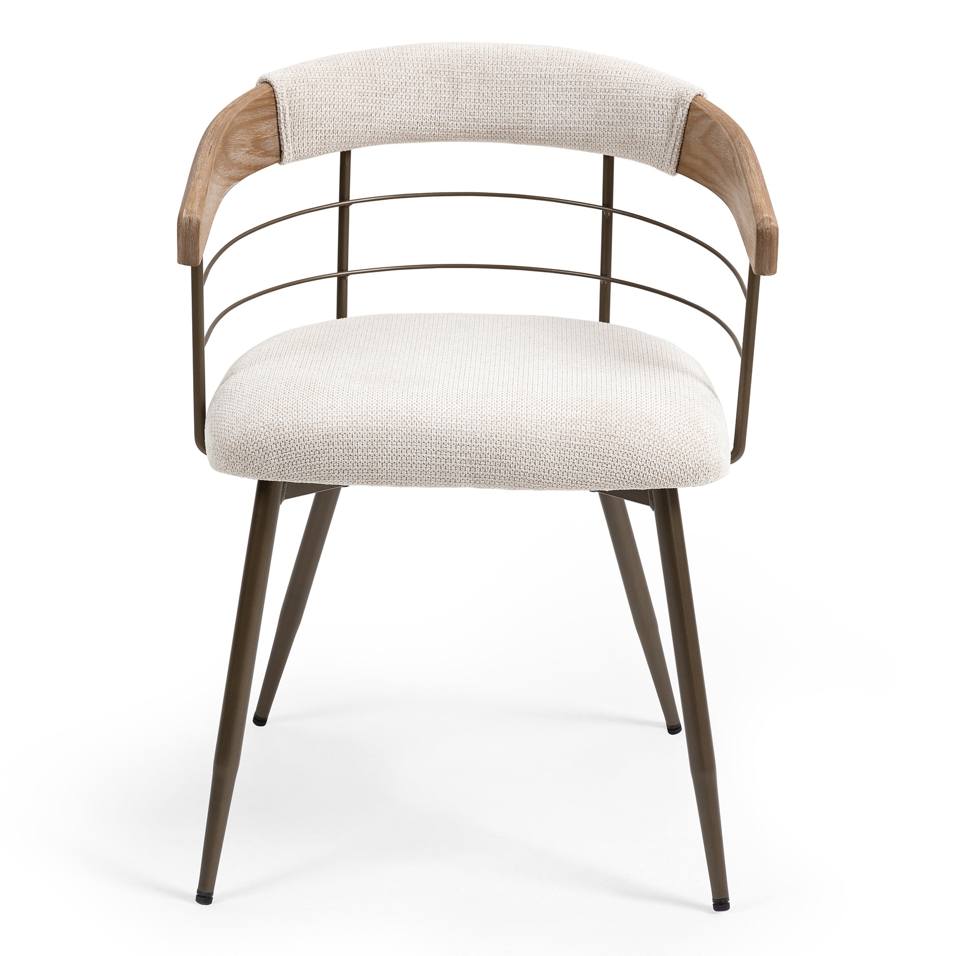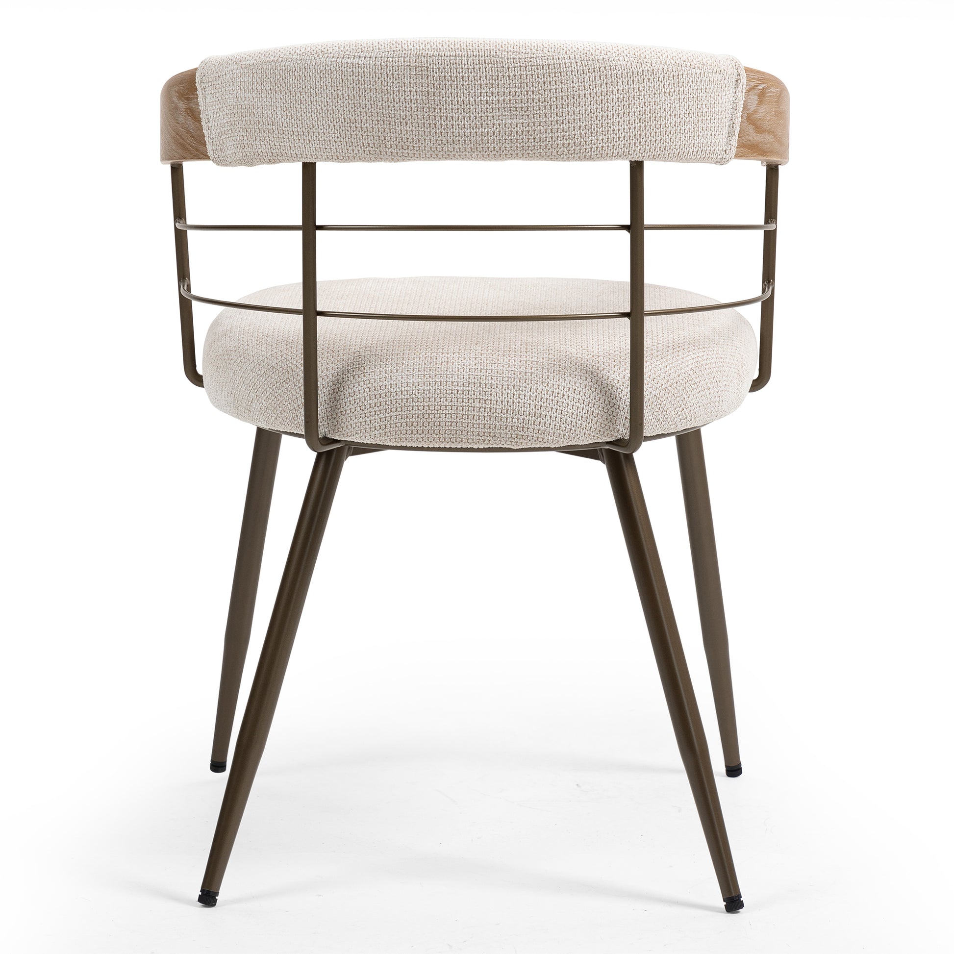 Indulge in comfort and contemporary style with our beige washed woven fabric dining chair. Crafted with plush upholstered fabric for luxurious comfort, it seamlessly merges with any decor. Copper iron legs and white washed wood arms provide a sleek contrast, adding a touch of modern sophistication to your dining space. Elevate every meal with this chic and versatile seating solution.