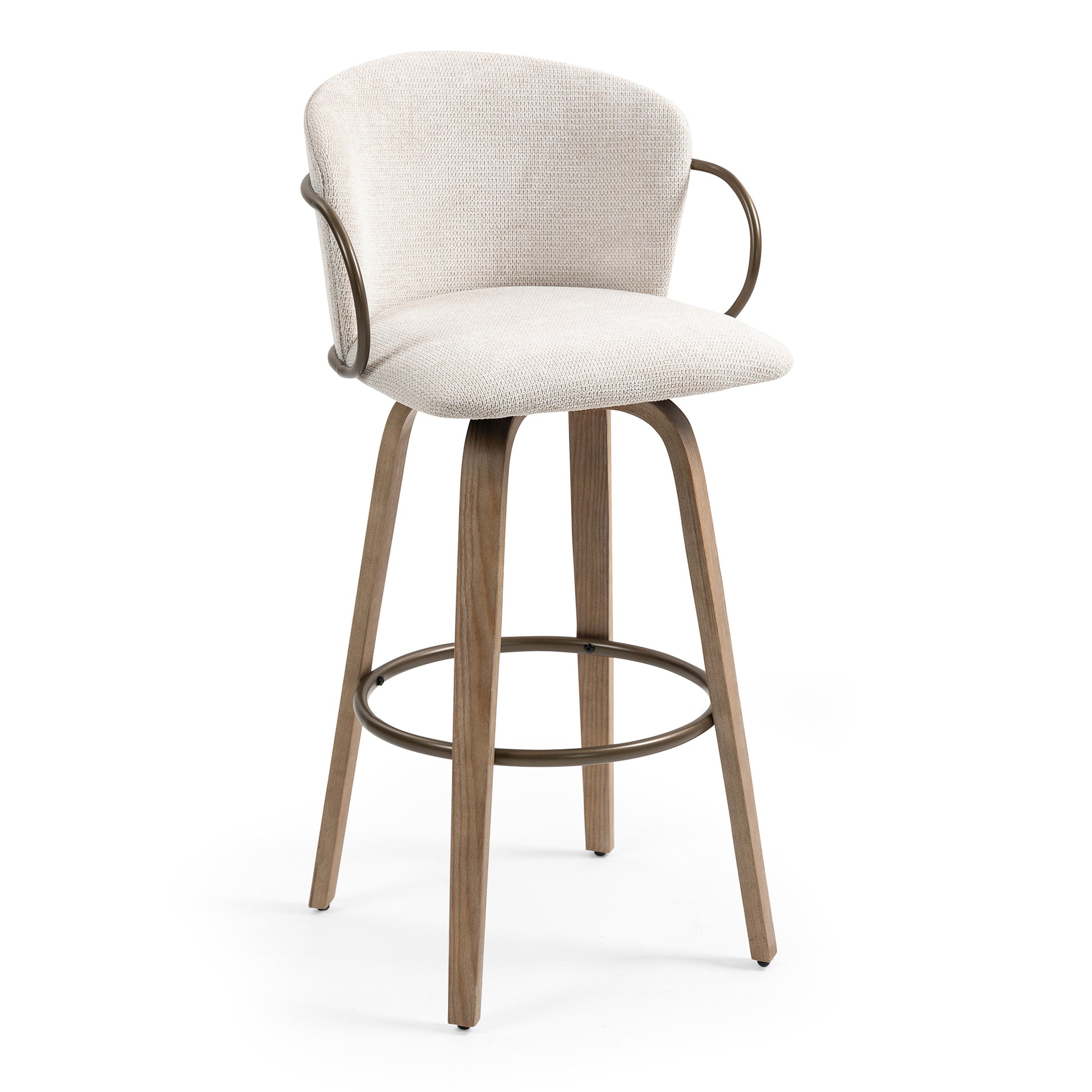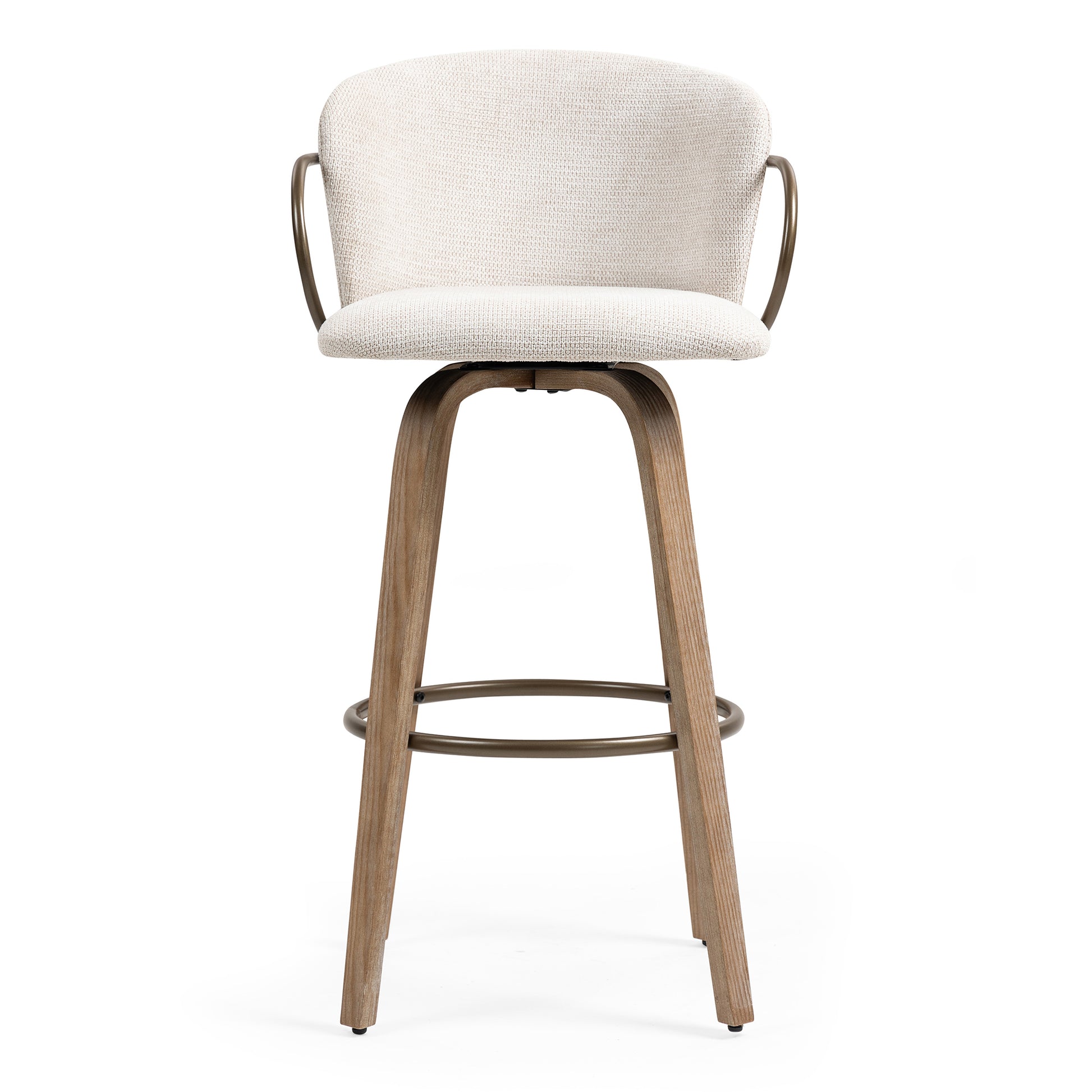 Set of 2 Bette Beige Washed Woven Fabric Swivel Bar Stool with Wood Legs and Copper Iron Arms